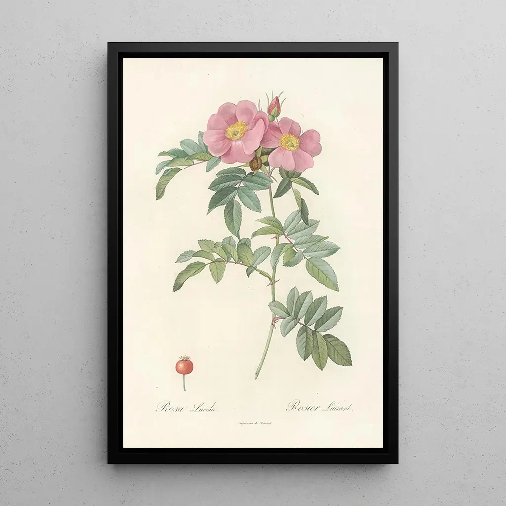 Rosa Lucida, et af Pierre Joseph Redoutés ikoniske kunsttryk, fremkalder en tidløs ynde gennem sine delikat malede kronblade. Kompositionen fremhæver nuancer af rosa og grøn, hvilket skaber en visuel harmoni, der straks tiltrækker opmærksomheden. Gouache-teknikken, som kunstneren mestrer, gør det muligt at gengive teksturer og lysreflekser på blomsterne med præcision. Atmosfæren, der udspringer af dette lærred, er både rolig og fængslende, og inviterer til en langvarig refleksion over den naturlige skønhed.
