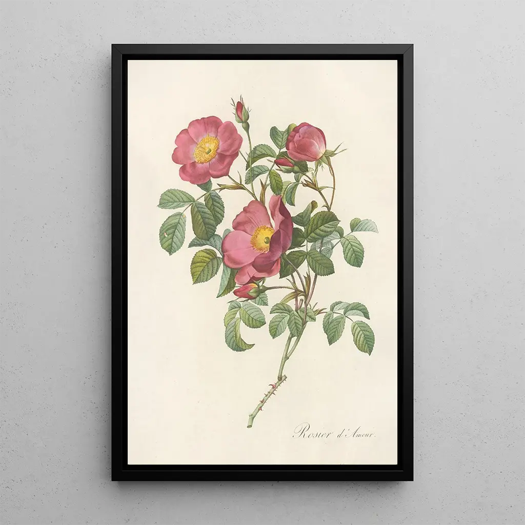 Kunsttrykket af Rosa Pumila, udført af Pierre Joseph Redouté, er en sand fejring af naturen. Dette delikate værk fremhæver finheden af blomsterbladene og rigdommen af farver, fra blid lyserød til strålende hvid. Redoutés akvarel-teknik gør det muligt at fange lyset på en subtil måde, hvilket skaber en blid og beroligende atmosfære. Hvert detalje, fra bladnerver til blomster nuancer, er omhyggeligt gengivet, hvilket inviterer betragteren til en stilfærdig eftertanke. Den harmoniske sammensætning af dette lærred fremkalder en hemmelig have, hvor den flygtige skønhed af blomsterne fremhæves med en tidløs elegance.
