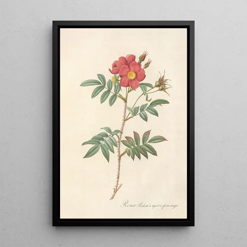 Den kunsttryk af Rosa Redutea Rubescens, værk af Pierre Joseph Redouté, er en sand hyldest til passionen og skønheden ved roser. Dette maleri, med sine strålende nuancer af rød og rosa, tiltrækker straks opmærksomhed og fremkalder en følelse af varme og energi. Akvarelteknikken, mestret af Redouté, giver en næsten taktil tekstur til kronbladene og skaber en levende og vibrerende atmosfære. Hvert detalje er omhyggeligt udarbejdet, hvilket inviterer betragteren til at dykke ned i det rige og farverige blomsterunivers.