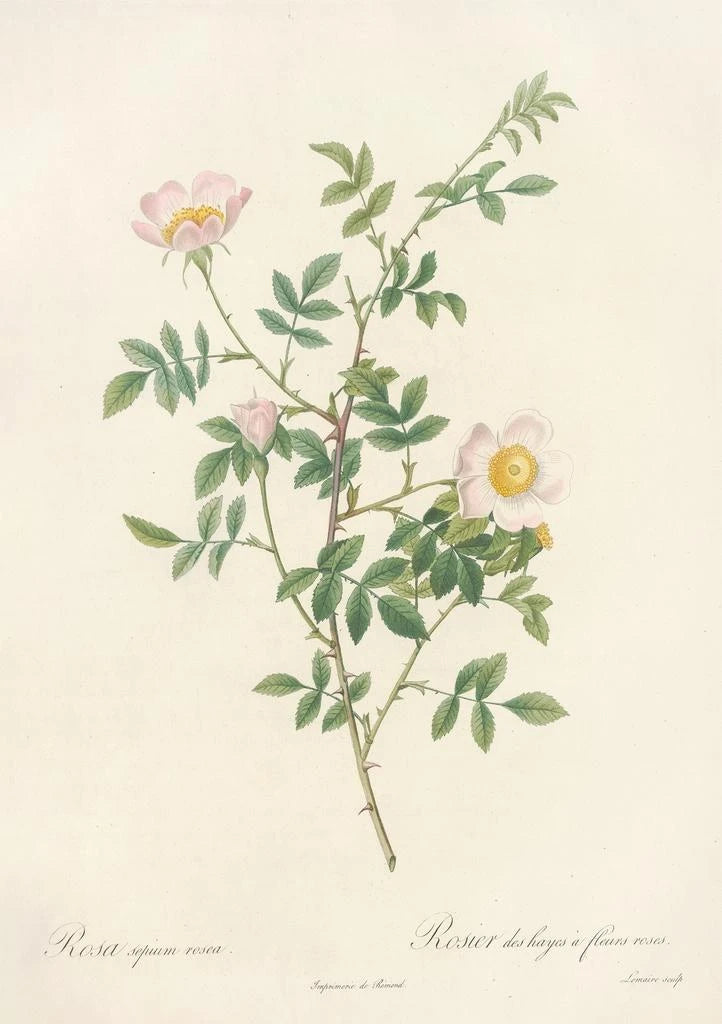 Den kunsttryk af Rosa Sepium Rosea, et ikonisk værk af Pierre Joseph Redouté, fører os ind i en verden af blidhed og lethed. Kronbladene, i en sart rosa nuance, blomstrer yndefuldt, mens de grønne nuancer i bladene skaber en beroligende kontrast. Akvarelteknikken, mestret af Redouté, giver dette lærred en uovertruffen luminositet, næsten eterisk. Hvert detalje, fra dugdråber til bladnervier, er gengivet med en præcision, der inviterer til eftertanke. Den overordnede atmosfære i værket fremkalder en hemmelig have, et sted hvor den naturlige skønhed blomstrer uden begrænsninger.