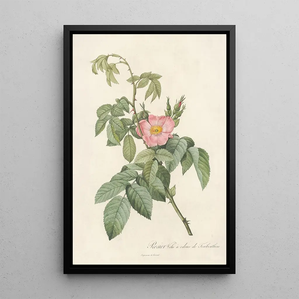 Kunsttrykket af Rosa Villosa Therebenthina, et ikonisk værk af Pierre Joseph Redouté, fører os ind i en botanisk verden fyldt med poesi. De delikate nuancer af rosa og grøn væves harmonisk sammen og skaber en blid og beroligende atmosfære. Akvarelteknikken, som Redouté beherskede, gør det muligt at fange lyset og teksturen af blomsterbladene med bemærkelsesværdig præcision. Hvert detalje, fra de fint årede blade til de blomstrende blomster, inviterer til en opmærksom betragning og afslører naturens flygtige skønhed.