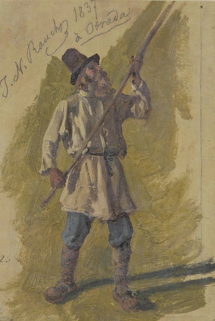 Kunsttrykket "Payslønner i Rusland" skildrer med stor finesse den daglige tilværelse for landmænd i et landligt landskab. Szenen viser en mand i fuld aktivitet, hans dynamiske holdning og koncentrerede udtryk vidner om indsats og beslutsomhed. De jordfarvede nuancer, kombineret med strejf af grønt og blåt, fremhæver rigdommen i markerne og naturens skønhed. Johann Nepomuk Rauch's teknik, der blander realisme og følsomhed, gør det muligt at fange ægtheden af dette øjeblik og hylde de hårdtarbejdende bønders liv.