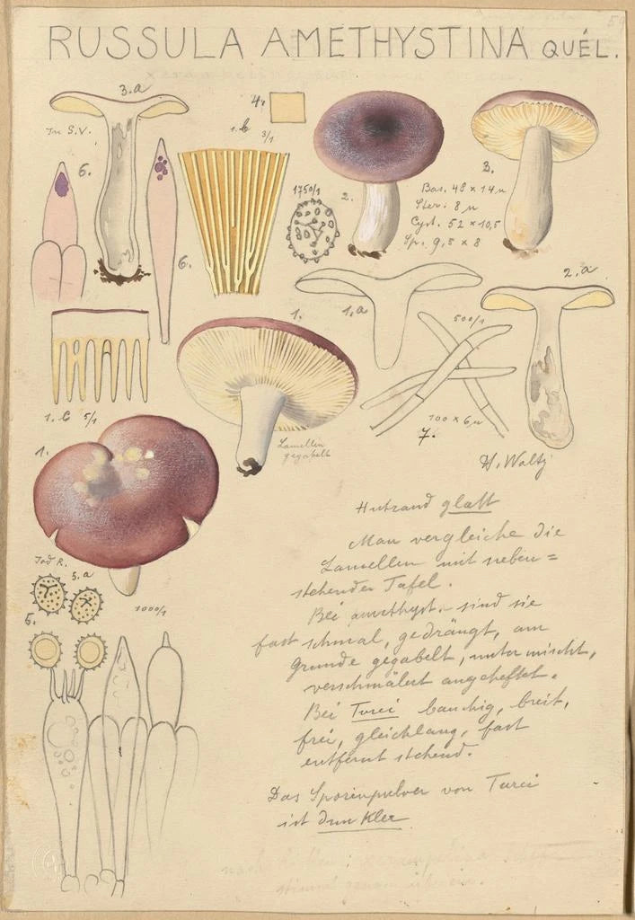 Kunsttrykket af Russula amethystina tager os med ind i en livlig verden, hvor naturen udtrykker sig med glans. Dette værk af Hans Baldung, skabt med en omhyggelig teknik, fremhæver rige nuancer af violet og grøn, der fremkalder skønheden af svampe i deres naturlige habitat. Atmosfæren, der udspringer af dette lærred, er både mystisk og beroligende, hvilket inviterer seeren til at udforske de delikate detaljer i hvert element. De organiske former og de subtile nuancer skaber en visuel harmoni, der fanger øjet og stimulerer fantasien, hvilket gør dette værk til en ægte hyldest til biodiversiteten.