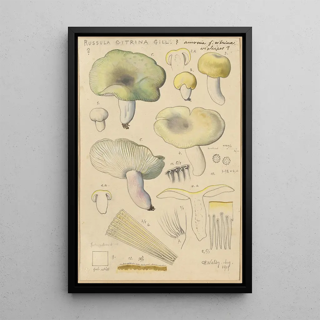 Russula citrina Gill er et kunsttryk, der fremhæver rigdommen og mangfoldigheden i den svampeverden. I dette lærred fanger Hans Baldung med finesse nuancer af gult og grønt, der kendetegner denne svamp, og skaber en lys og livlig stemning. Kompositionen er omhyggeligt afbalanceret, hver detalje er gengivet med en præcision, der vidner om kunstnerens talent. Atmosfæren, der udspringer af dette kunsttryk, er både glædesfyldt og kontemplativ, hvilket inviterer betragteren til at værdsætte naturens flygtige skønhed.