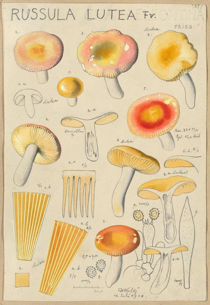 I dette fængslende værk inviterer Hans Baldung os til at udforske den fascinerende verden af svampe gennem hans skildring af Russula lutea. De livlige nuancer af gult og orange, kombineret med grønne toner, skaber en atmosfære, der er både levende og mystisk. Baldungs teknik, der blander realisme og stilisering, giver liv til dette svampe, hvilket placerer det i centrum af en komposition, der fremhæver naturens rigdom. Hvert detalje, fra de fine konturer til de subtile skygger, vidner om kunstnerens evne til at fange essensen af sit motiv, samtidig med at det inviterer betragteren til en dyb refleksion.