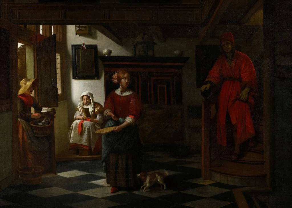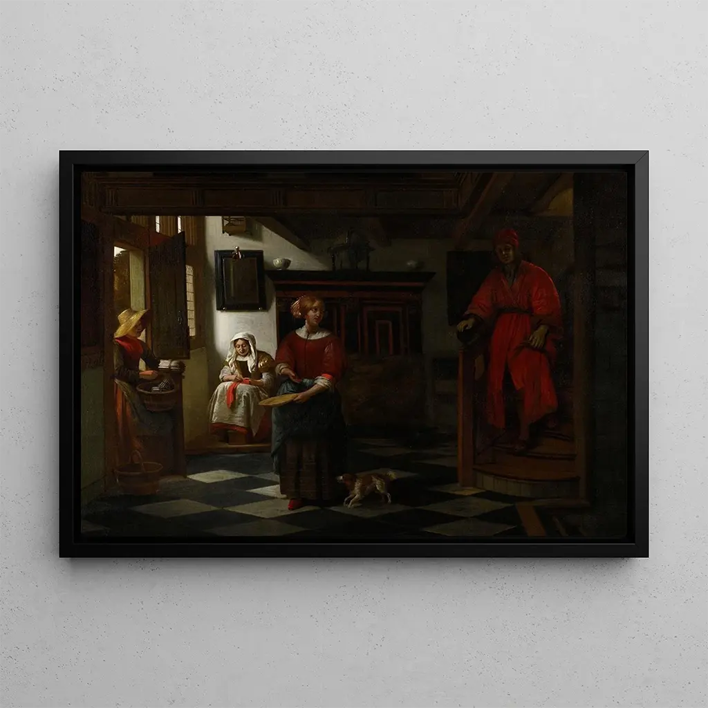 Pieter de Hooch, aktiv i det 17. århundrede, er kendt for sine scener af dagligdagen, ofte præget af bemærkelsesværdig ro og intimitet. Påvirket af samtidige som Vermeer, skiller Hooch sig ud ved sin evne til at lege med lys og rum. Hans kunsttryk, ofte centreret omkring interiører og menneskelige interaktioner, vidner om en tid, hvor realisme og skildring af hverdagslivet havde en fremtrædende plads i hollandsk kunst. Hooch formåede at fange essensen af borgerlig liv, hvilket gør ham til en uundværlig kunstner i sin tid.