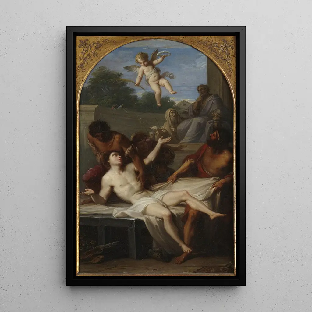 I dette slående værk illustrerer Placido Costanzi martyrdom af Saint Laurent, et øjeblik af intens tro og lidelse. Den dynamiske komposition, med figurer i bevægelse og dramatiske udtryk, fanger opmærksomheden og vækker dyb følelse. De varme farver, især de røde og guld, understreger scenens alvor, samtidig med at de fremhæver det guddommelige lys, der synes at omslutte den hellige. Costanzis teknik, der blander realisme og barokke elementer, skaber en atmosfære, der er både tragisk og åndelig, og inviterer seeren til at reflektere over ofret og troen.