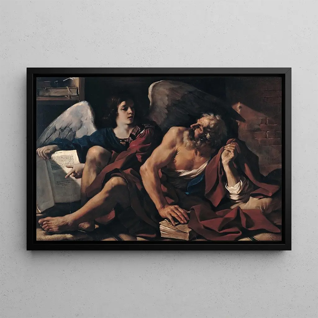 Saint Matthieu og englen : en guddommelig møde mellem himmel og jord I dette ikoniske kunstværk fanger Guercino et øjeblik med intens spiritualitet, hvor Saint Matthieu, den hellige evangelist, bliver guidet af en engel. Kompositionen er præget af slående kontraster mellem dybe skygger og strålende lys, typisk for chiaroscuro. De varme farver, fra jordnære brune til lyse guldnuancer, skaber en atmosfære, der er både intim og hellig. Teknikken med oljemaling giver liv til personernes udtryk, hvilket gør følelsen af dette mystiske møde håndgribelig. Hvert detalje, fra klædernes fold til englens fjer, vidner om en omhyggelig sans for detalje, der inviterer til eftertanke. Guercino : en mester af den italienske barok Guercino, hvis rigtige navn er Giovanni Francesco Barbieri, er en italiensk kunstner fra det XVII. århundrede, kendt for sin barokstil, der kombinerer realisme og udtryksfuldhed. Influenceret af Caravaggio udvikler han en chiaroscuro-teknik, der fremhæver følelserne hos sine motiver. Aktiv i Bologna, skiller han sig ud ved sin evne til at skabe værker, der er både dramatiske og poetiske. Hans karriere er præget af prestigefyldte bestillinger, og han efterlader en varig arv inden for kunstverdenen. Kunstværket "Saint Matthieu og englen" illustrerer perfekt hans talent og betydning i udviklingen af den barokke kunst. En dekorativ investering med mange fordele Dette kunsttryk af "Saint Matthieu og englen" er et centralt stykke, der vil berige dit hjem, uanset om det er i en stue, et kontor eller et soveværelse. Kvaliteten af kunsttrykket sikrer en bemærkelsesværdig trofasthed til det originale værk, hvilket gør det muligt at værdsætte hver nuance af farve og minutøst detalje. Det æstetiske tiltrækningskraft af dette lærred gør det til et ideelt valg for dem, der ønsker at tilføre elegance og spiritualitet til deres indretning. Ved at integrere dette maleri i dit rum, gør du ikke blot dit miljø smukkere, men inviterer også til refleksion og eftertanke.