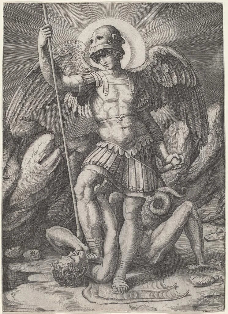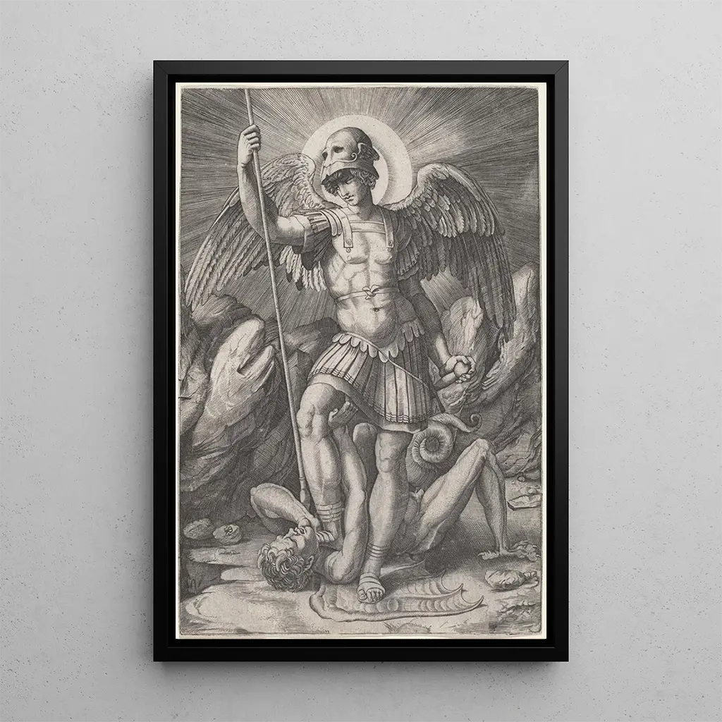 I dette slående værk skildrer Marco Dente Saint Michel, den krigeriske ærkeengel, i en dynamisk og imponerende positur. Kompositionen er præget af livlige farver og kraftige kontraster, der fremhæver den himmelske figurers styrke. Den graveringsteknik, Dente anvender, gør det muligt at fange de fine detaljer i rustningen og de udspilede vinger på ærkeenglen. Atmosfæren, der udspringer af dette lærred, er både heroisk og åndelig, hvilket inviterer betragteren til at reflektere over kampen mellem godt og ondt. Denne kunsttryk af maleriet er en sand hyldest til mod og tro.