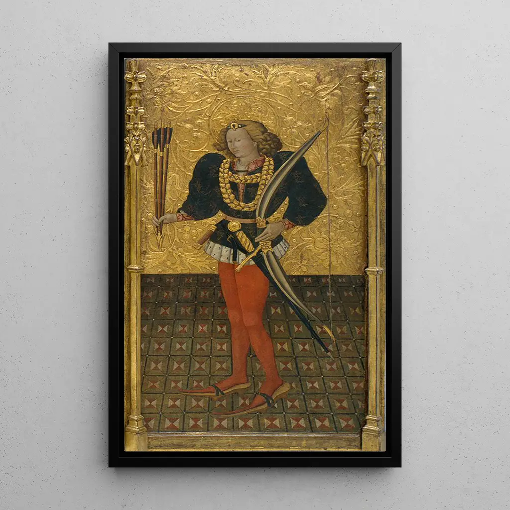 Kunsttrykket af Saint Sébastien af Jaume Ferrer dykker os ned i en scene præget af spiritualitet og lidelse. De livlige farver, især de røde og de guldtoner, står i kontrast til den blege krop, hvilket skaber en atmosfære, der er både tragisk og sublim. Teknikken i maleriet, med sine omhyggelige detaljer, antyder en enestående mestring, mens lyset synes at lege over overfladerne og fremhæve scenens følelser. Dette kunstværk inviterer til dyb refleksion, hvor betragteren både er vidne til smerte og skønhed.