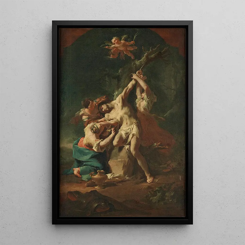 I dette fængslende værk skildrer Paul Troger Saint Sébastien omgivet af kvinder, hvilket skaber en atmosfære, der både er tragisk og følelsesladet. De livlige farver og de omhyggelige detaljer afslører en imponerende teknisk kunnen. Tøjets foldninger, ansigtudtryk og det lys, der oplyser scenen, vidner om en sjælden kunstnerisk følsomhed. Den dynamiske komposition guider blikket gennem figurerne og fremhæver kontrasten mellem heltenes lidelse og kvindernes blidhed, der omgiver ham. Dette kunsttryk inviterer til en dyb refleksion over ofring og medfølelse, samtidig med at det fejrer livets skønhed.