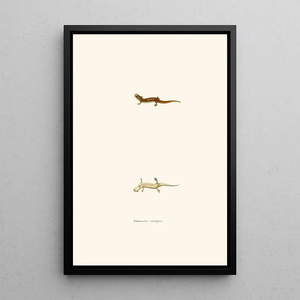 Den kunsttryk af Salamander med cirrer, et fascinerende værk af John Edwards Holbrook, tager os med ind i en verden, hvor naturen afslører sig i sine mest fængslende former. Dette kunsttryk fremhæver salamanderen, med sine delikate cirrer og sine livlige farver, og skaber en visuel harmoni, der fortryller betragteren. De omhyggelige detaljer, gengivet med en raffineret akvarelteknik, giver liv til dette amfibie, og fremkalder en atmosfære af mysterie og vild skønhed. Den dynamiske sammensætning tiltrækker blikket og inviterer til en omhyggelig betragning, der afslører de subtile aspekter af det akvatiske liv.