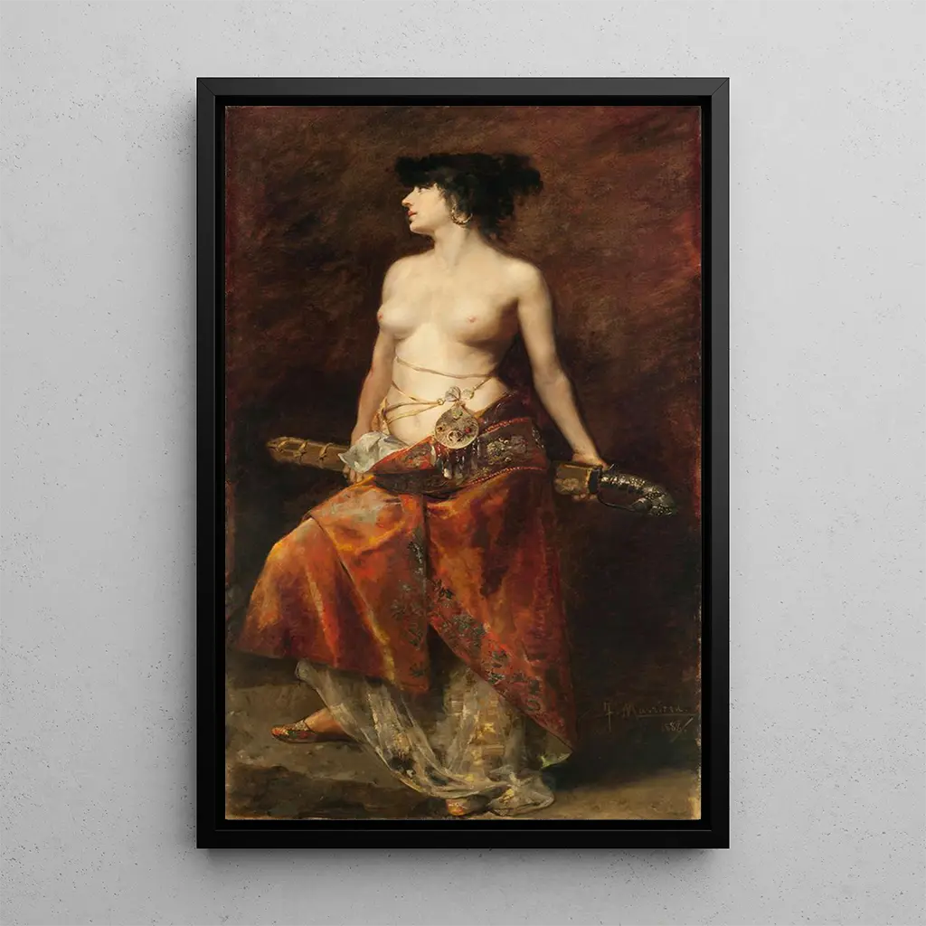 Francesc Masriera, aktiv i slutningen af det 19. århundrede og begyndelsen af det 20. århundrede, er en anerkendt spansk maler kendt for sin rige og stemningsfulde stil. Påvirket af symbolismens bevægelse, interesserer han sig for at skildre menneskelige følelser og mytologiske fortællinger. Salomé er et af hans mest berømte værker, der illustrerer hans talent for at fusionere æstetisk skønhed med dybe temaer. Masriera formåede at fange den kollektive fantasi i sin tid, hvilket gør ham til en vigtig figur i spansk kunsthistorie, hvis indflydelse stadig mærkes i dag.