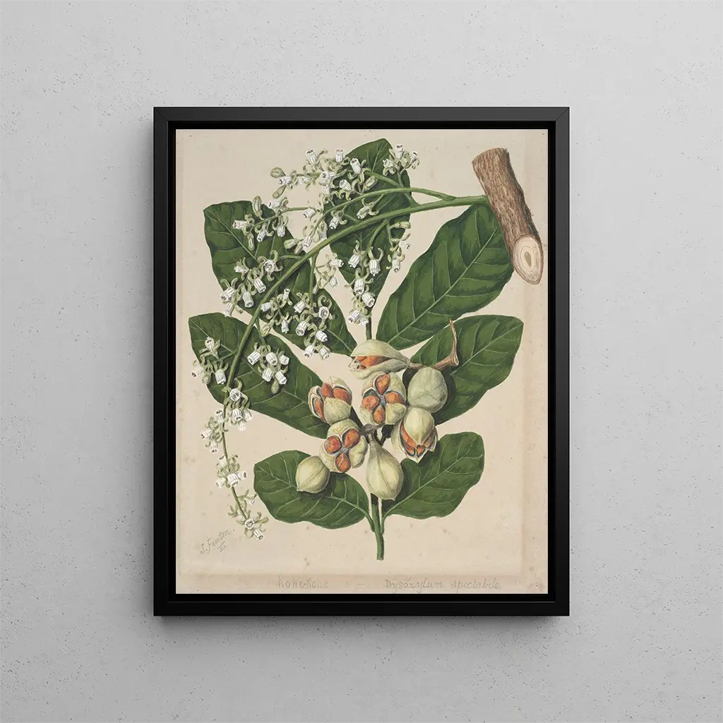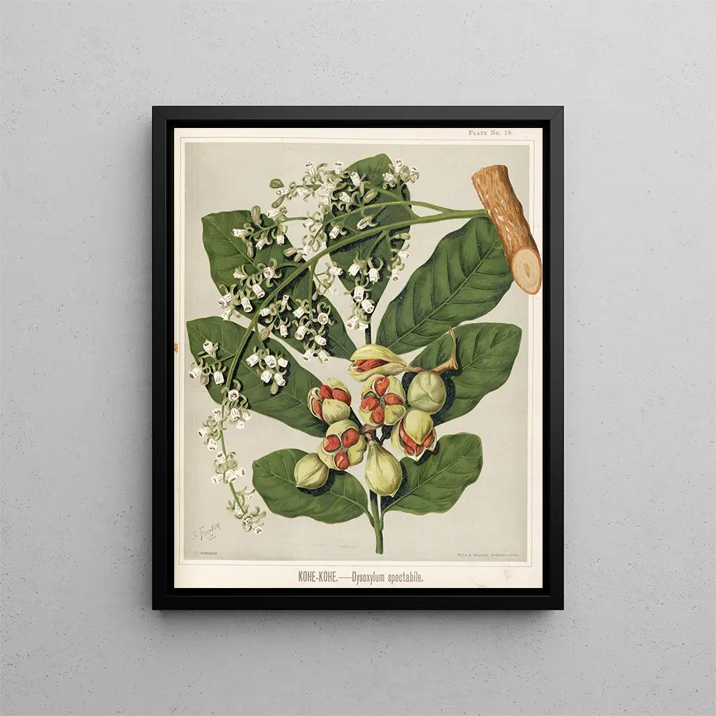 I dette værk fremhæver Sarah Featon KoheKohe, eller Dysoxylum spectabile, et majestætisk træ fra New Zealand. Med en bemærkelsesværdig sans for detaljer fanger Featon skønheden i dette træ og dets spektakulære blomster. Hendes kunstneriske stil, der kombinerer præcision og følsomhed, hylder den rige flora i New Zealand. Featons illustrationer er ikke kun botaniske gengivelser, men også kunstværker, der beriger vores moderne indretning. De tilføjer et strejf af eksotisme og natur, og integreres harmonisk i forskellige dekorationsstile. Disse værker er ideelle for dem, der ønsker at skabe et beroligende og inspirerende miljø. Opdag denne illustration på Artem Legrand, og lad dig forføre af magien i den newzealandske flora.