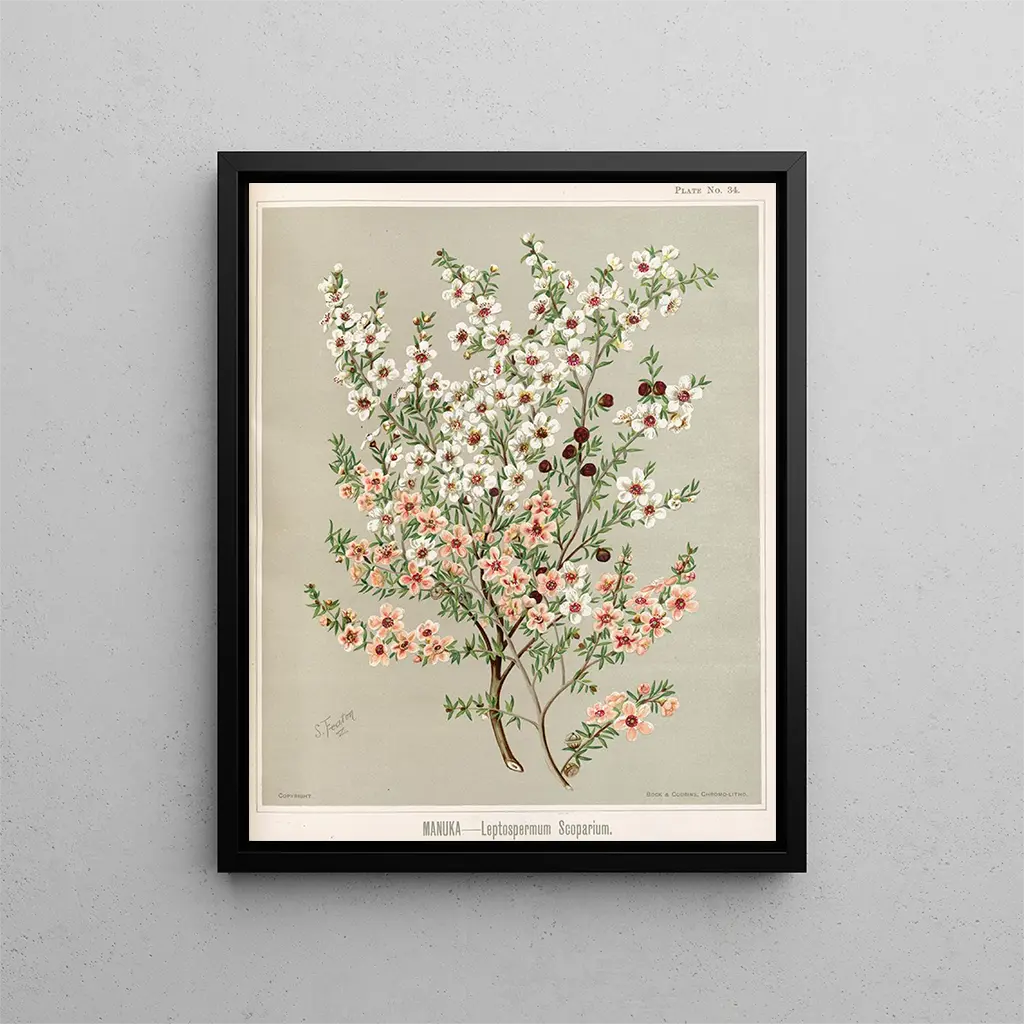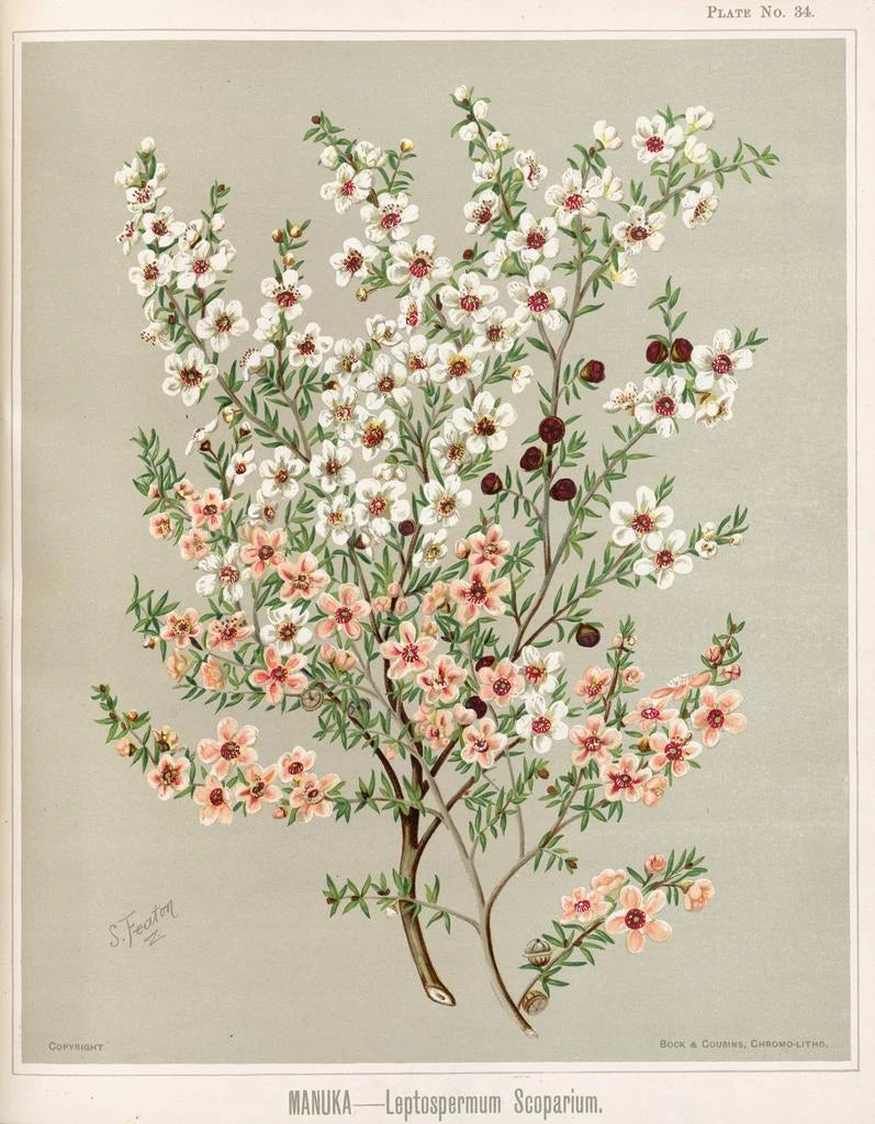 I 'Manuka Leptospermum scoparium' illustrerer Sarah Featon med stor dygtighed denne plante, der er bredt anerkendt for sine medicinske egenskaber og sin betydning i māori-kulturen. Featon, som botanisk kunstner fra det 19. århundrede, har formået at kombinere videnskabelig præcision med kunstnerisk følsomhed, hvilket har skabt værker, der går ud over blot illustration. Skønheden i manuka, med sine delikate blomster og aromatiske blade, er fanget med en omhu, der fanger øjet og stimulerer fantasien. Dette maleri er ikke blot en fejring af den nye zelandske biodiversitet, men også en invitation til at udforske forbindelserne mellem natur og kultur. I en moderne ramme kan dette værk tilføre et strejf af autenticitet og ro. Kunsttrykket af denne illustration kan opleves på Artem Legrand.