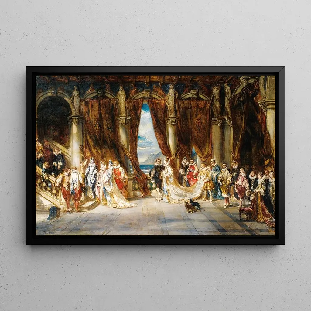 Scene af dans: en dans i hjertet af elegance I denne kunsttryk af Scene af dans fanger Eugène Isabey essensen af en social aften, hvor ynde og lethed blander sig med en vibrerende atmosfære. Personerne, klædt i overdådige kostumer, synes at svæve over dansegulvet, mens de skinnende farver og fine detaljer skaber en festlig stemning. Akvarelteknikken, brugt med mesterlighed, giver liv til hver bevægelse, hvert smil, og inviterer betragteren til at fordybe sig i dette levende maleri. Lysets glans og de bløde nuancer fremkalder et øjeblik fanget i tiden, en fejring af skønhed og livskunst. Eugène Isabey: vidne til XIX. århundredes pragt Eugène Isabey, fransk maler og akvarelkunstner fra XIX. århundrede, er kendt for sin evne til at indfange scener fra dagligdagen og historiske begivenheder med en unik følsomhed. Påvirket af romantikken, lever han i en æra hvor kunsten afspejler samfundets skikke og aspirationer. Hans værker, ofte præget af melankoli og poesi, vidner om et opmærksomt blik på menneskets natur og sociale interaktioner. Gennem sine kreationer har Isabey formået at fange ånden af sin tid, hvilket gør ham til en uundværlig kunstner i sin epoke. En dekorativ erhvervelse med mange fordele Kunsttrykket af Scene af dans er et ideelt dekorativt stykke til at berige dit hjem, uanset om det er i en stue, et kontor eller et soveværelse. Dets trykkvalitet og trofasthed mod de originale farver gør dette maleri til en ægte æstetisk fordel. Ved at hænge det på dine vægge tilføjer du et strejf af elegance og raffinement til dit rum, samtidig med at du vækker beundring hos dine gæster. Dette lærred, både kunstnerisk og evocerende, inviterer til drømme og eftertanke, og skaber en varm og indbydende atmosfære.
