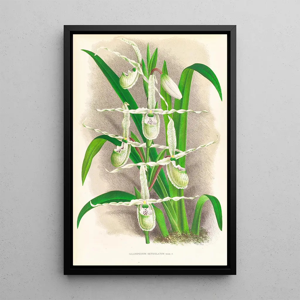 Den kunsttryk af Selenipedium Reticulatum af Jean Jules Linden fremkalder en frodig verden, hvor naturen udtrykker sig i al sin pragt. Dette livlige lærred, rigt på nuancer af grønt og violet, fanger blomstens delikatesse, samtidig med at det fremhæver deres komplekse struktur. Linden's teknik, der kombinerer akvarel og olie, skaber en næsten drømmeagtig atmosfære, der inviterer betragteren til at dykke ned i en fascinerende blomsterverden. De omhyggelige detaljer i kronblade og blade, kombineret med en subtilt sløret baggrund, forstærker indtrykket af bevægelse og liv, som om disse blomster er ved at blomstre foran vores øjne.