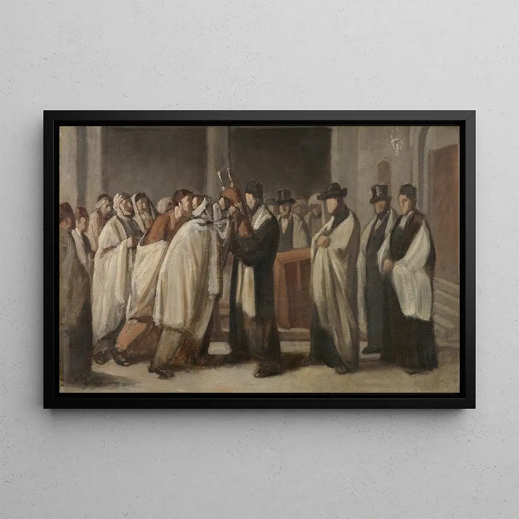 Service du sabbat : en fejring af den jødiske tradition Den kunsttryk af Édouard Moyse, der forestiller Service du sabbat, skildrer med finesse en intim og åndelig scene. De rige farver og de omhyggelige detaljer fordyber betragteren i den hellige atmosfære af denne fejring. Personerne, klædt i traditionelle kostumer, er afbildet med stor udtryksfuldhed, hvilket afspejler dybden af de jødiske ritualer. Det bløde lys, der udspringer fra scenen, skaber en varm stemning, der inviterer til refleksion over spiritualitet og fællesskab, essentielle elementer i denne ældgamle praksis. Édouard Moyse : en kunstner engageret i at skildre det jødiske liv Édouard Moyse, aktiv i det 19. århundrede, er en fransk kunstner af jødisk oprindelse, kendt for sine værker, der fremhæver det jødiske liv og traditioner. Påvirket af romantikken søger han at fange sjælen i sine motiver gennem kompositioner fyldt med følelser. Hans karriere er præget af et engagement i at repræsentere den jødiske kultur på en autentisk måde, hvilket bidrager til en bedre forståelse og værdsættelse af dette samfund. Hans værker, ofte præget af nostalgi, vidner om en tid, hvor tradition og modernitet levede side om side. En dekorativ kunsttryk med mange fordele Den kunsttryk af Service du sabbat er et værdifuldt tilskud til enhver kunstsamling, der tilføjer et strejf af kultur og historie til dit rum. Uanset om det er i en stue, spisestue eller et kontor, fremkalder dette billede værdier som fællesskab og gæstfrihed. Dets trykkvalitet sikrer en enestående nøjagtighed af detaljerne i det originale værk, samtidig med at det har en fængende visuel appel. Ved at vælge dette lærred beriger du din indretning med et stykke, der fortæller en historie og inviterer til eftertanke.