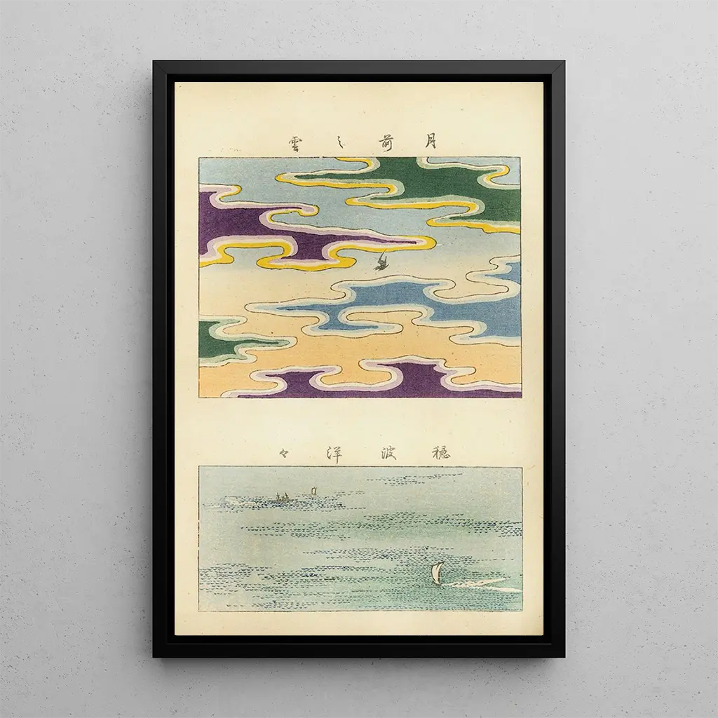 Kunsttrykket af Shin zuan Pl 2 fremkalder en fredelig atmosfære, hvor nuancer af blå og grøn væves sammen for at skabe en scene fyldt med ro. Teknikken med ukiyo-e, typisk for japansk kunst, kommer til udtryk i de omhyggelige detaljer og de delikate teksturer. Hvert element i kompositionen synes at fortælle en historie, der inviterer betragteren til at dykke ned i en verden af eftertanke. De organiske former og blomstermotiver, karakteristiske for dette værk, giver en følelse af bevægelse og liv, samtidig med at de bevarer en tidløs elegance.