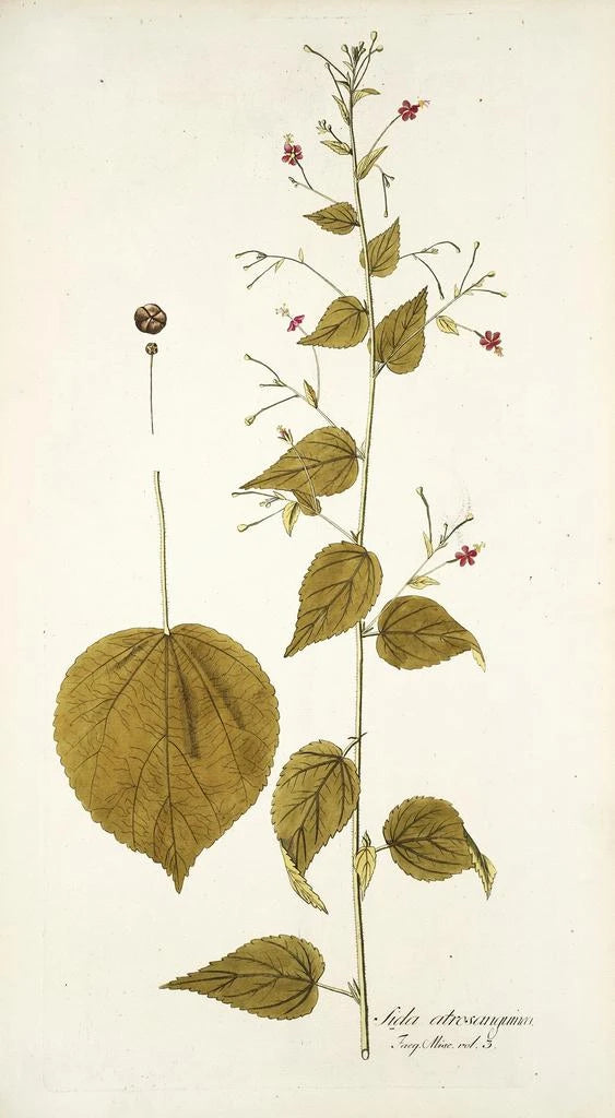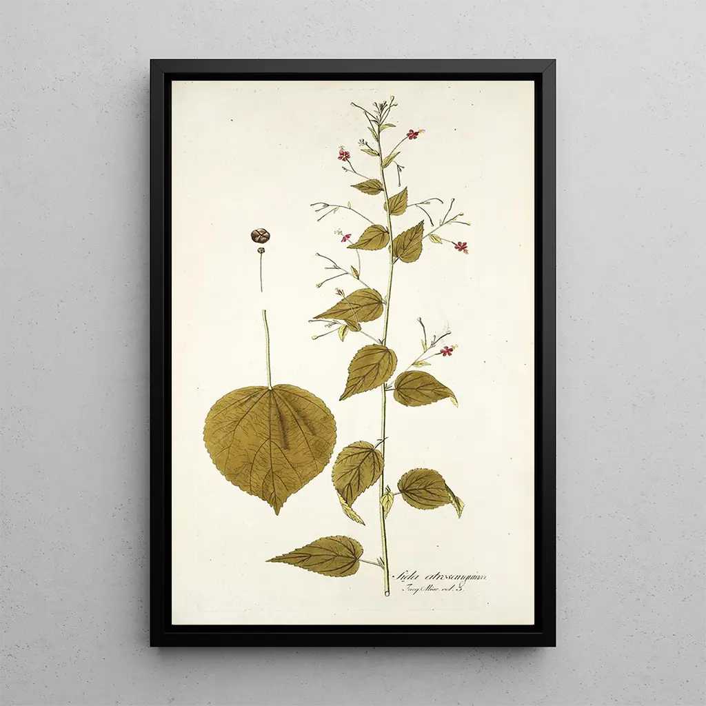 Kunsttrykket af Sida atrosanguinea tager os med ind i en fascinerende botanisk verden, hvor de levende nuancer af rød og grøn smukt flettes sammen. Dette værk, udført med omhu og præcision, fremhæver detaljerne i blade og blomster og indfanger selve essensen af planten. Akvarelteknikken, som kunstneren har anvendt, giver en lethed til hele værket og skaber en atmosfære, der både er rolig og livlig. Hvert penselstrøg synes at fortælle en historie og inviterer betragteren til at udforske naturens skønhed gennem en kunstnerisk linse.