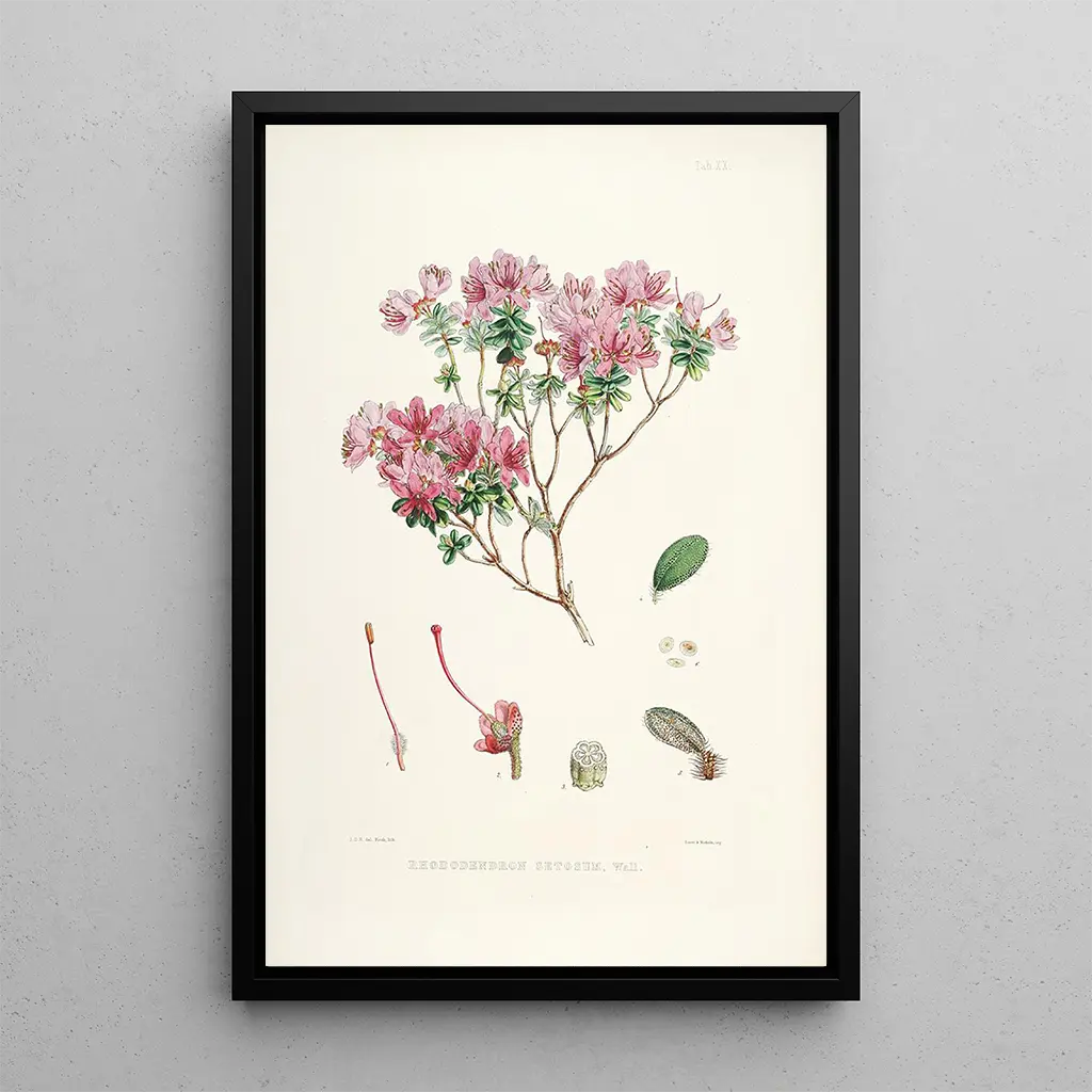 I dette livlige værk fanger Walter Hood Fitch den flygtige skønhed af rhododendronerne, ikoniske for Himalaya. De strålende nuancer af rosa, lilla og hvid blandes harmonisk, hvilket skaber et maleri, der fremkalder den rige flora i alpine områder. Akvarelteknikken, anvendt med dygtighed, formidler delikatesse af blomsterbladene og lysstyrken i bladene. Atmosfæren, der udspringer af dette kunsttryk, er både rolig og opkvikkende, og inviterer betragteren til at dykke ned i en frodig naturlig verden, hvor hver detalje er omhyggeligt observeret.