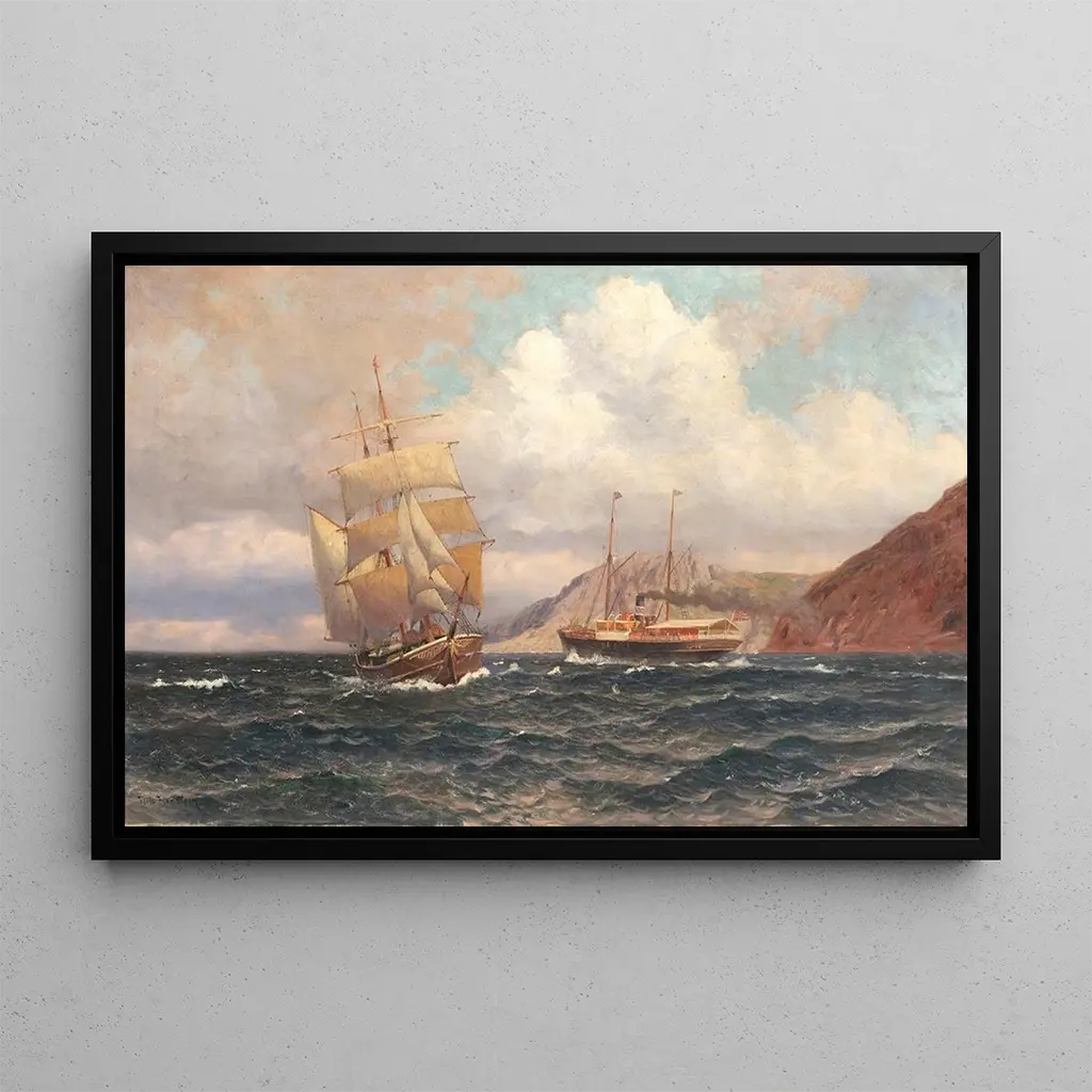 Navires i havet, et fængslende kunsttryk af Nils Severin Lynge Hansteen, fremkalder majestæten af oceanerne og eventyrlystnen, der driver søfolkene. Nuancer af blå, grøn og hvid blandes harmonisk, hvilket skaber en atmosfære, der er både fredelig og dynamisk. Hansteens teknik, med sine flydende penselstrøg og sin beherskelse af lyset, giver liv til disse skibe, der elegant sejler på bølgerne. Skyerne, som både er truende og beroligende, tilføjer en dramatisk dimension til scenen, hvilket inviterer til eftertanke og flugt. Dette værk er en ægte fejring af havet og den frihed, det symboliserer.