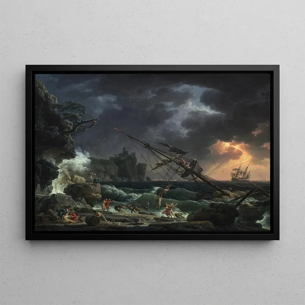 Claude-Joseph Vernet, aktiv i det attende århundrede, er berømt for sine kunsttryk af havet og stormene. Påvirket af rokoko-bevægelsen har han formået at kombinere en virtuos teknik med en dramatisk følsomhed, hvilket gør ham til en af de mest respekterede malere af maritime motiver i sin tid. Hans værker, ofte bestilt af aristokrater, vidner om en fascination af havet og dets farer, og afspejler også tidens bekymringer om navigation og maritim handel. "Le Naufrage" passer perfekt ind i denne tradition og illustrerer de udfordringer, som søfolkene stod overfor.