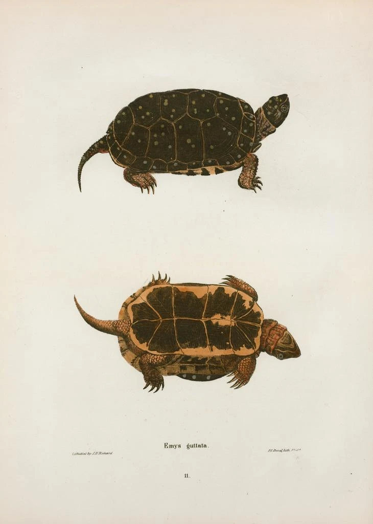 John Edwards Holbrook, naturalist og illustratør fra det 19. århundrede, markerede sin tid med sine bidrag til zoologisk illustration. Hans passion for krybdyr og amfibier førte til værker med stor videnskabelig præcision. Kunsttrykket af Tortue ponctuée, blandt hans mest ikoniske værker, vidner om hans engagement i at repræsentere dyrelivet trofast. Holbrook formåede at forene kunst og videnskab, hvilket påvirkede, hvordan dyrearter blev opfattet i hans tid. Hans arv består, hvilket gør ham til en uundværlig figur inden for naturalistisk illustration.