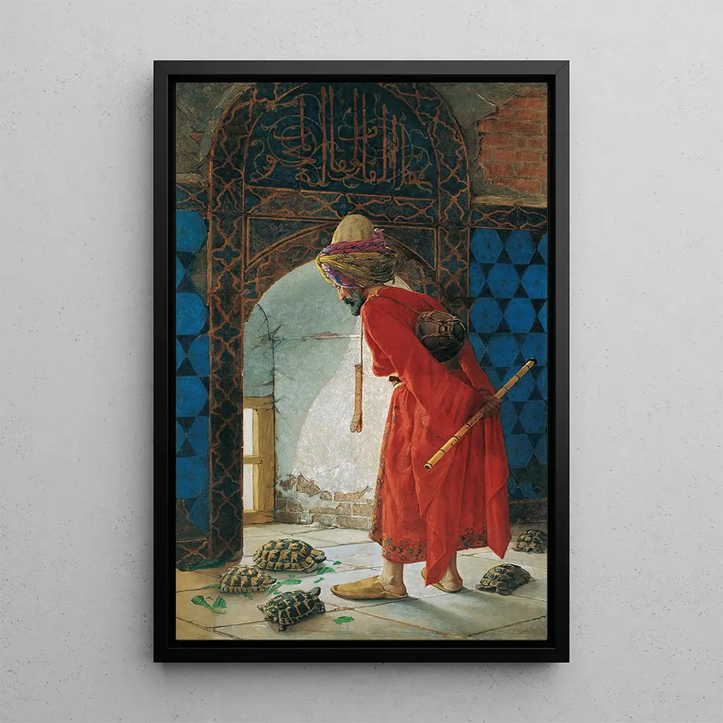 I "Le dresseur de tortues" dykker Osman Hamdi Bey ned i en verden, hvor naturen og mennesket sameksisterer i harmoni. Lærredet, rigt på detaljer, skildrer en mand i traditionelt tøj, der fanger opmærksomheden fra en majestætisk skildpadde. De varme, jordnære farver kombineret med grønne nuancer skaber en fredelig og eftertænksom atmosfære. Kunstnerens teknik, der blander realisme med orientalske påvirkninger, bringer denne scene til live og inviterer seeren til at reflektere over forholdet mellem menneske og dyr. Hvert element i kompositionen synes at fortælle en historie, hvilket gør dette værk til et ægte narrativt kunsttryk.