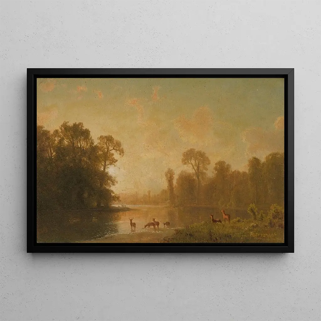 I dette fængslende kunsttryk tager Albert Bierstadt os med til hjertet af et majestætisk landskab, hvor skumringen omgiver scenen med en blid melankoli. Hjortene, elegante silhuetter, bevæger sig yndefuldt gennem en skov badet i gyldent lys. De varme farver og de delikate nuancer i himlen blander sig harmonisk med de mørkere toner i træerne, hvilket skaber en atmosfære, der er både fredelig og mystisk. Bierstadts teknik, kendetegnet ved en slående realisme og en omhyggelig opmærksomhed på detaljer, inviterer os til at betragte naturens flygtige skønhed.