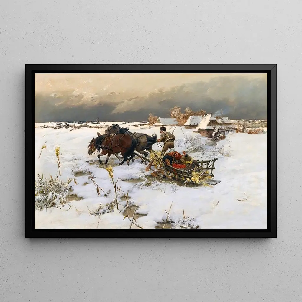 Kunsttrykket af La promenade en traîneau af Jaroslav Věšín indfanger et øjeblik af vinterglæde, hvor den uberørte sne omgiver landskabet. De farverige slæder, trukket af heste, står i kontrast til den skinnende hvide jord, hvilket skaber en livlig og dynamisk scene. Věšíns teknik, der blander realisme og impressionistiske strejf, giver liv til dette værk, hvor hver detalje, fra snefnug til smilende ansigter, bidrager til den festlige og varme vinterstemning.