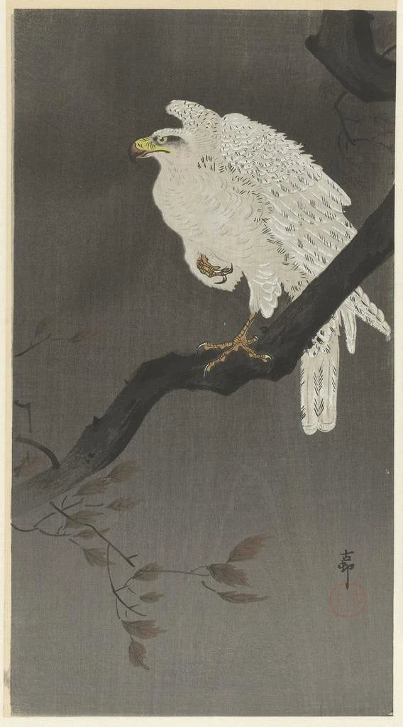 L'œuvre "Aigle neigeux sur une branche d'arbre" d'Ohara Koson évoque une scène empreinte de sérénité og kraft. Det maleriske værk viser en majestætisk L, med omhyggeligt detaljerede fjer, der sætter sig på en gren. De bløde og nuancerede farver, der spænder fra skinnende hvid til bleg blå, skaber en beroligende vinterlig atmosfære. Teknikken med tryk på papir, typisk for japansk kunst, gør det muligt at fange naturens flygtige skønhed, samtidig med at der skabes en fascinerende visuel dybde. Koson formår at formidle en følelse af ro, hvilket inviterer betragteren til at beundre den vilde skønhed af dette ikoniske fugl.