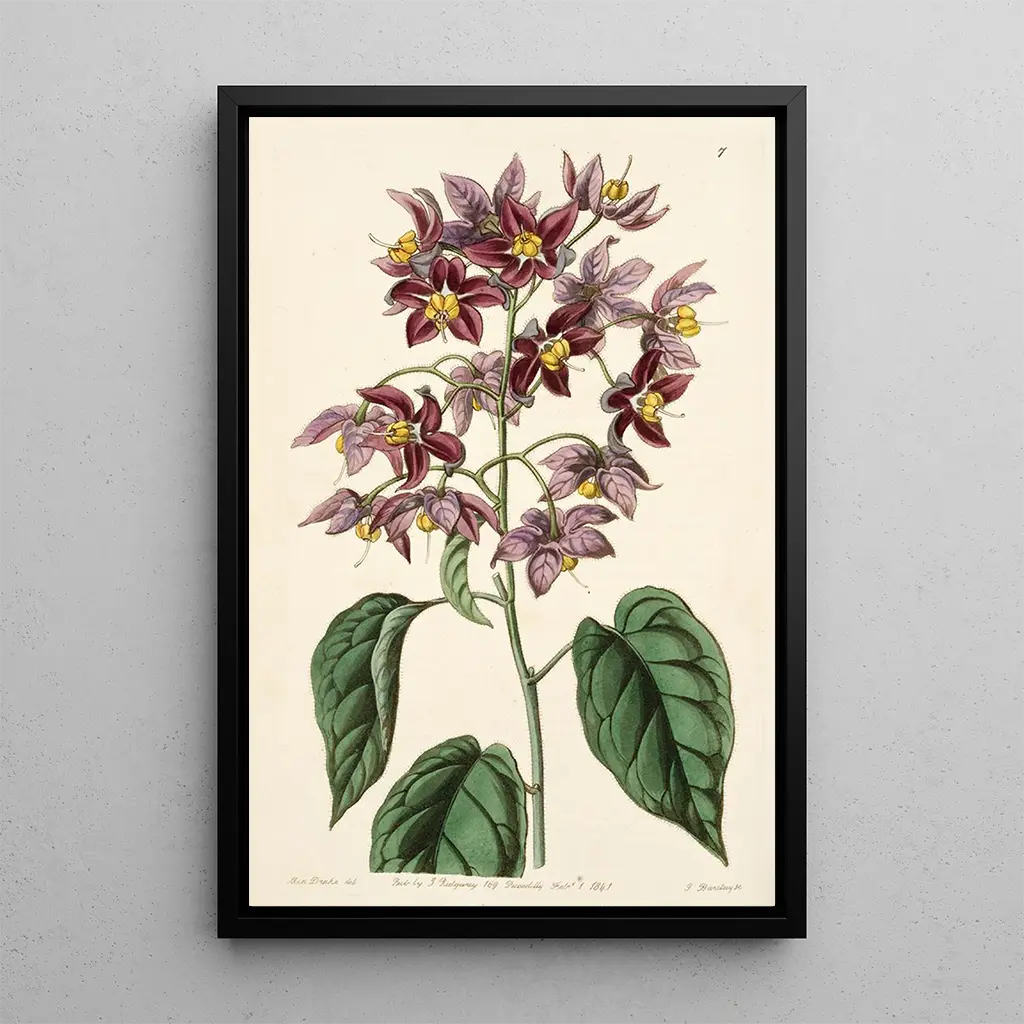 Kunsttrykket Douce-amère à grandes anthères tager os med til en verden, hvor naturen blomstrer med ynde. De skinnende farver på blomsterne, kombineret med fine detaljer, fremkalder en følelse af lethed og friskhed. Akvarelteknikken, mestret af Sydenham Edwards, formår at gengive gennemsigtigheden af blomsterbladene og dybden af skyggerne. Dette værk, både poetisk og videnskabeligt, inviterer til en omhyggelig betragning af naturens vidundere og afslører de skjulte skønheder i planterne.