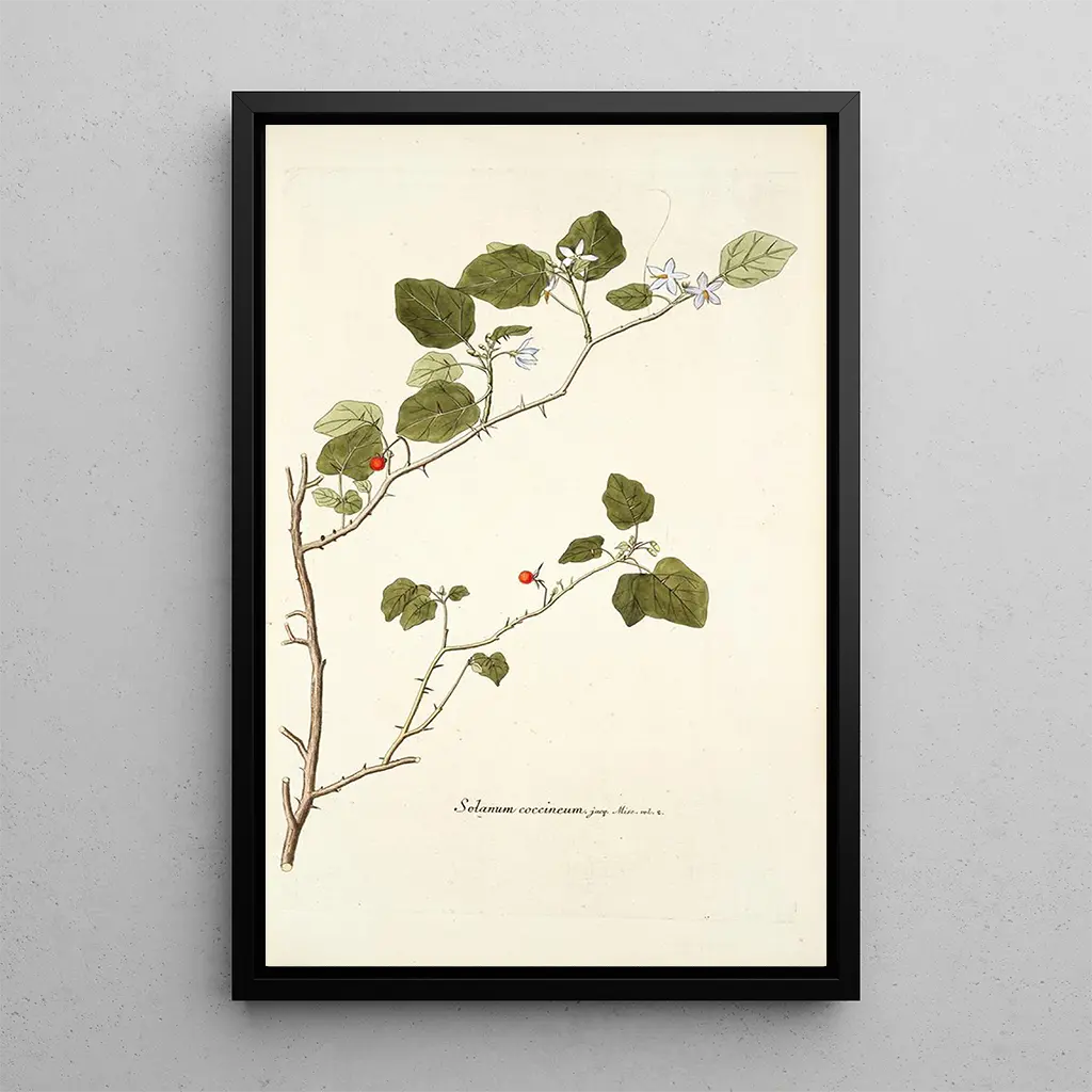 Kunsttrykket af Solanum coccineum, værk af Nikolaus Joseph Freiherr von Jacquin, tilbyder en fængslende vision af denne plante med livlige blomster. De varme farver, fra gult til rødt, blander sig harmonisk for at skabe en dynamisk og fængslende komposition. Teknikken med akvarel, mestret af Jacquin, gør det muligt at gengive den fine tekstur af kronblade og blade, samtidig med at den næsten håndgribelige livskraft indpodes i værket. Atmosfæren, der udspringer af dette lærred, er både glædesfyldt og energisk, hvilket inviterer til forundring over naturens skønhed.