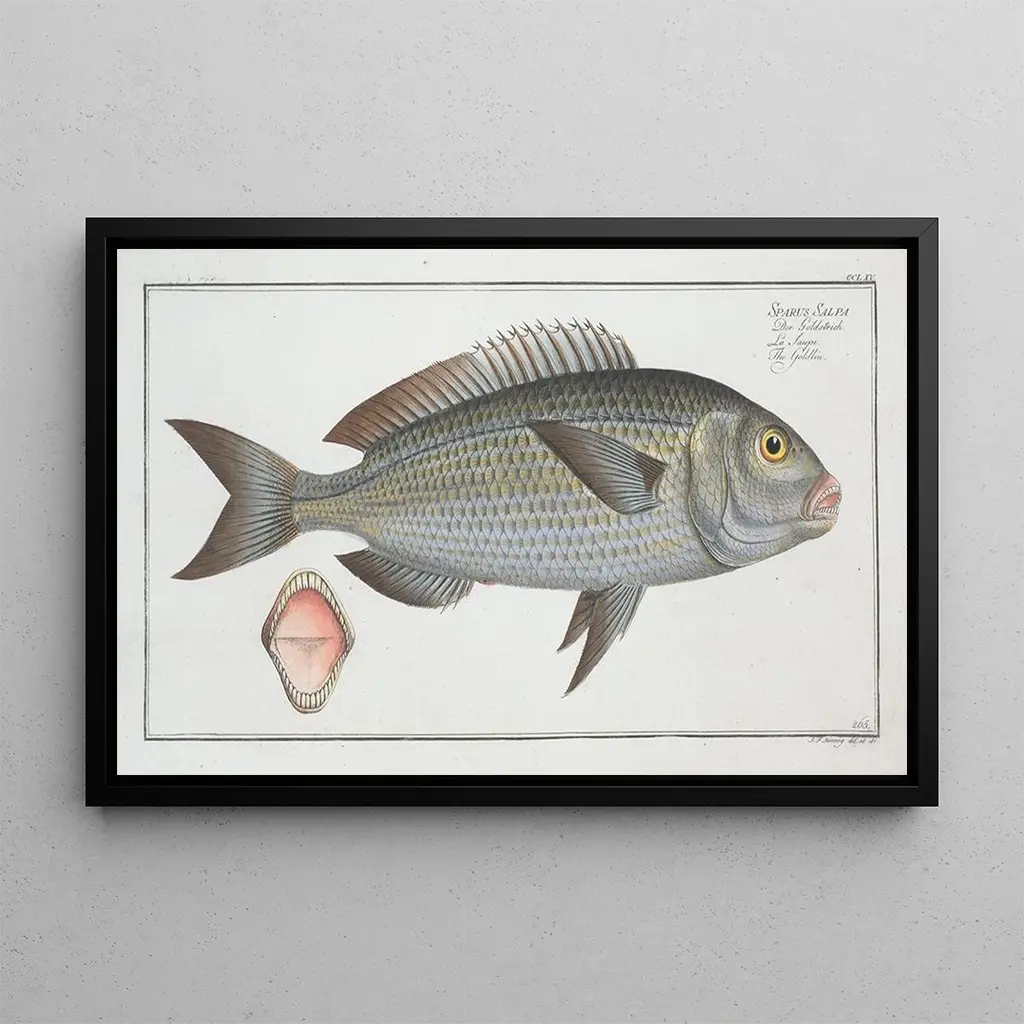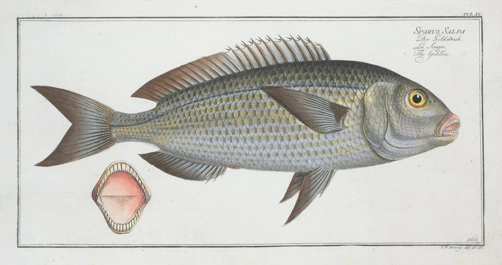 Marcus Elieser Bloch, tysk naturalist og kunstner fra det 18. århundrede, betragtes ofte som en af pionererne inden for ichthyologi, studiet af fisk. Hans passion for naturen førte til værker, der forener videnskab og kunst, som "Sparus Salpa Le Goldlin". Bloch rejste gennem Europa og længere væk for at studere og fremstille forskellige fiskearter, hvilket bidrog til den videnskabelige viden på hans tid. Hans omhyggelige tilgang og sans for detaljer gør hans værker til uundværlige referencer for biologientusiaster og kunstelskere. Værdien af hans arbejde ligger i hans evne til at forene æstetik og viden.
