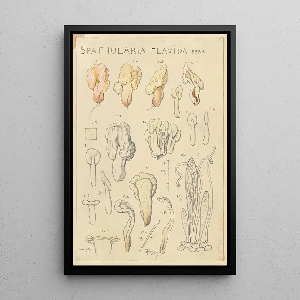 Spathularia flavida, et fascinerende kunsttryk af Hans Baldung, fremkalder en enestående skønhed gennem sine organiske former og delikate farver. Kompositionen, med sine nuancer af grøn og gul, skaber en atmosfære, der både er beroligende og tankevækkende. Baldungs teknik, der blander realisme og stilisering, giver liv til denne svamp, næsten håndgribelig. Hvert detalje, fra konturer til skygger, inviterer betragteren til at dykke ned i en naturlig verden, hvor magien sker. Dette kunsttryk er en ægte fejring af biodiversiteten, der fanger selve essensen af floraen.