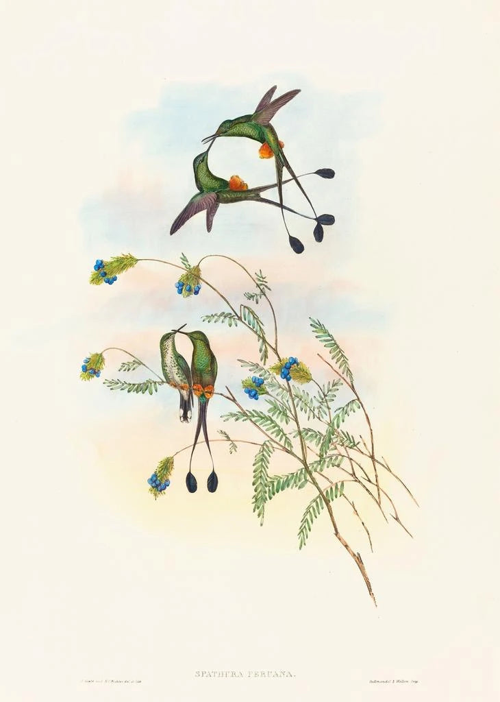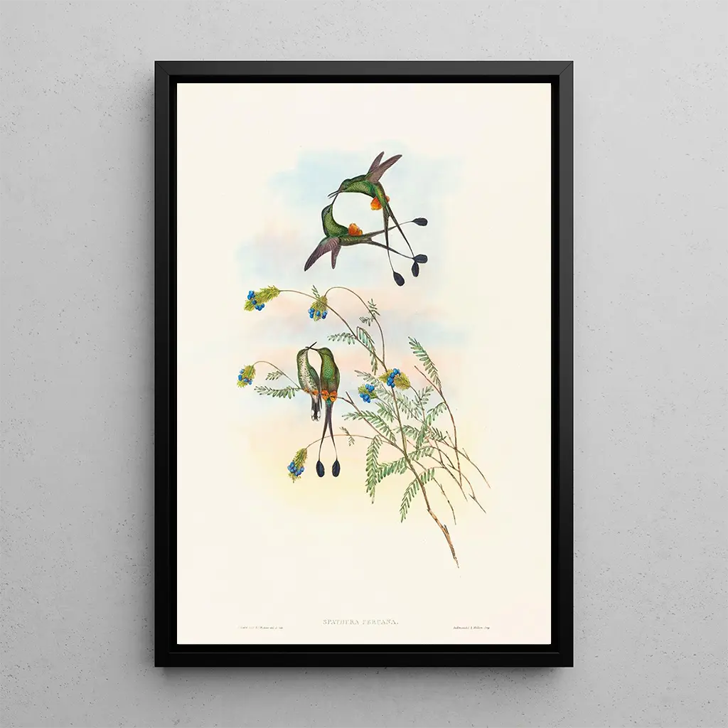 Den kunsttryk af Spathura péruvienne fordyber os i en livlig verden, hvor nuancer af grøn og gul flettes sammen for at give liv til denne fascinerende fugl. Med sine delikate fjer og sit skarpe blik fremkalder dette lærred en tropisk atmosfære, næsten magisk. John Goulds ornitologiske teknik, der kombinerer videnskabelig præcision og kunstnerisk følsomhed, gør det muligt at fange essensen af denne fugl. Hvert detalje, fra fjer til de omkringliggende blade, er gengivet med en omhu, der inviterer til eftertanke og forundring.