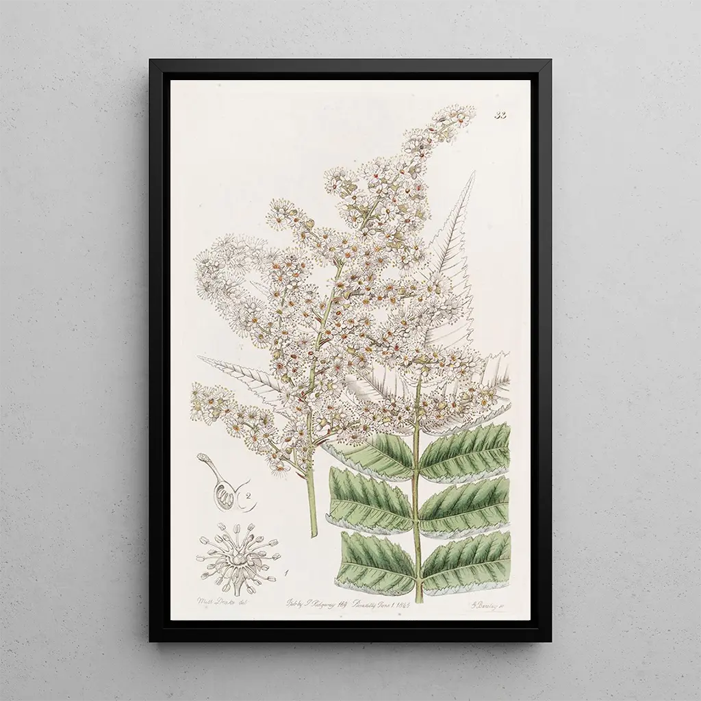 Kunsttrykket af Spirea af Dr Lindley, værk af Sydenham Edwards, er en sand hyldest til blomsterens skønhed. Pastelfarverne på kronbladene, der spænder fra ren hvid til blid rosa, blandes harmonisk med delikate grønne blade. Dette lærred, udført med en raffineret akvarel teknik, udstråler en blid og beroligende atmosfære, der minder om de frodige haver fra victoriatiden. Hvert detalje er omhyggeligt gengivet, hvilket giver betragteren mulighed for at værdsætte naturens finesse gennem kunstens prisme.