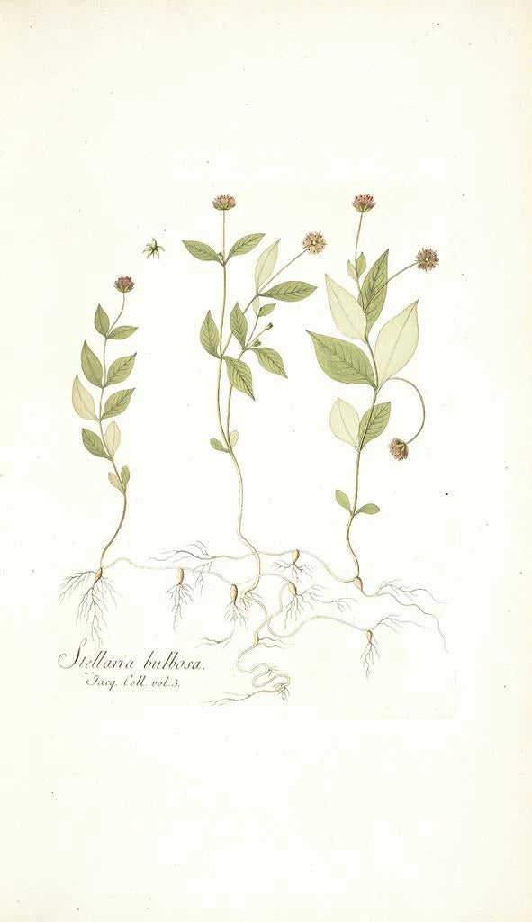 Nikolaus Joseph Freiherr von Jacquin er en ikonisk figur fra det 18. århundrede, der forener videnskab og kunst i sine botaniske fremstillinger. En anerkendt botaniker, der dedikerede sit liv til studiet af planter, påvirket af tidens opdagelser. Hans rejser gennem Europa og Caribien gav ham mulighed for at indsamle sjældne eksemplarer, som han illustrerede med bemærkelsesværdig præcision. Kunsttrykket af Stellaria bulbosa vidner om hans evne til at fange naturens skønhed, samtidig med at han respekterer de videnskabelige principper. Hans arv lever videre gennem hans værker, der fortsat inspirerer botanik- og kunstentusiaster.