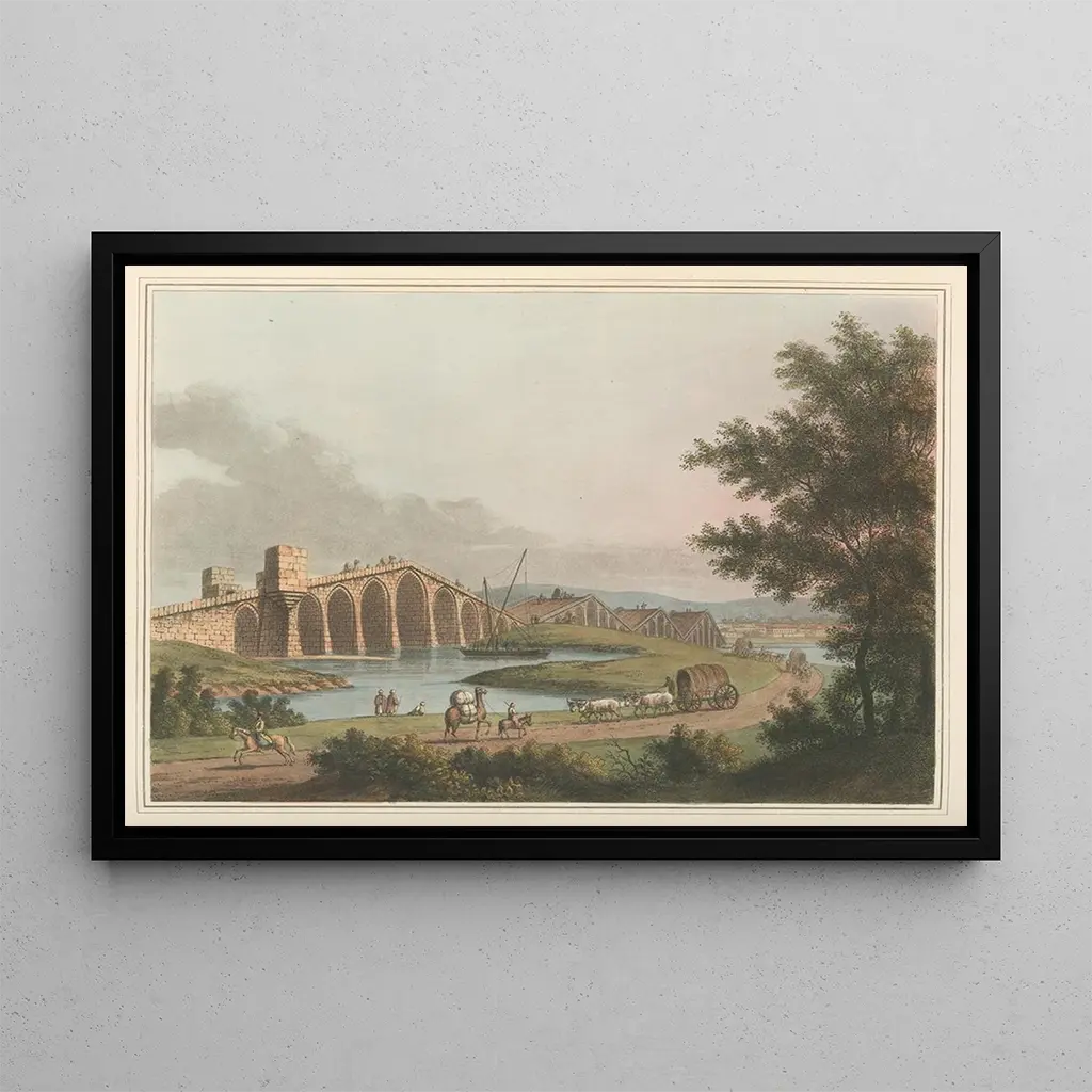 Kunsttrykket af Luigi Mayers Grand pont tager os med ind i en verden, hvor arkitektur smelter sammen med naturen. De delikate nuancer af blå og grøn, kombineret med glimt af gyldent lys, skaber en atmosfære, der er både fredelig og storslået. Den olie maleteknik, Mayer anvender, gør det muligt at gengive strukturernes detaljer med præcision, samtidig med at den tilfører en vis poesi til scenen. Dette maleri inviterer til eftertanke, hvor hvert element synes at fortælle en historie, og hvor broen bliver symbolet på en passage mellem to verdener.