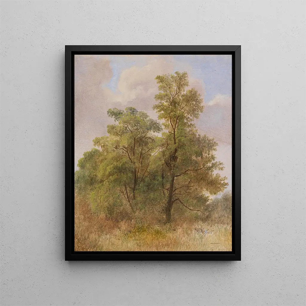 I den fortryllende verden af romantisk kunst skiller værket "Studie af træer" af Carl Spitzweg sig ud med sin charme og visuelle poesi. Denne delikate fremstilling af naturen inviterer betragteren til at dykke ned i en verden, hvor det grønne får liv under kunstnerens pensel. Træerne, majestætiske og rolige, står med en tidløs ynde, hvilket vidner om harmonien mellem mennesket og dets omgivelser. Værket, både enkelt og komplekst, fremkalder en atmosfære af ro, der dybt resonerer med dem, der tager sig tid til at observere det. Det er en invitation til eftertanke, et hængende øjeblik, hvor blikket forsvinder i nuancer af grønt og lyslege.