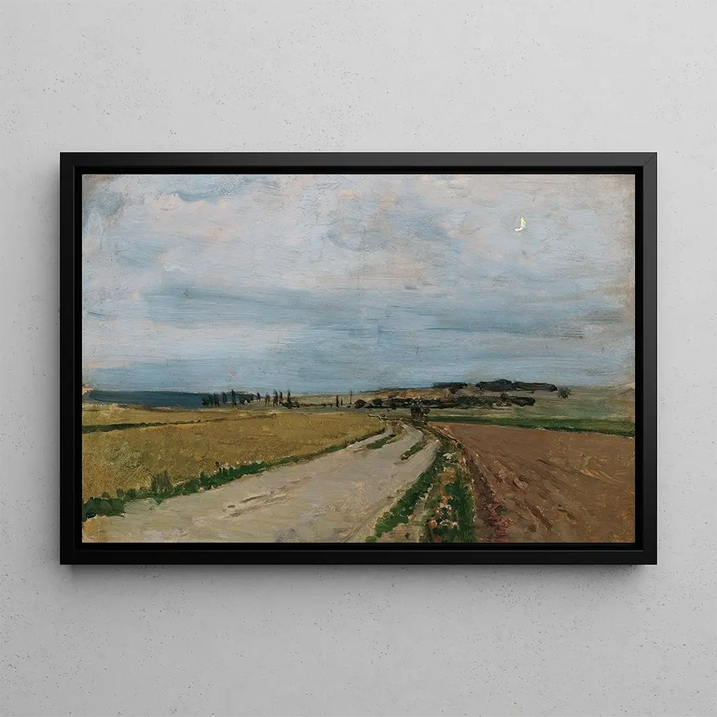 Kunsttrykket af Étude d'ambiance aften i Michelhausen Plankenberg, udført af Carl Moll, bringer betragteren ind i et beroligende landskab, hvor skumringens lys blander sig med skyggerne. De varme nuancer af orange og violet smelter harmonisk sammen og skaber en atmosfære af fred. Kompositionen, med sine bløde linjer og organiske former, fremkalder en følelse af ro og eftertanke. De fine detaljer i træerne og horisonten afslører Moll's tekniske kunnen, der formår at fange magien i et flygtigt øjeblik, hvor dagen giver plads til natten.