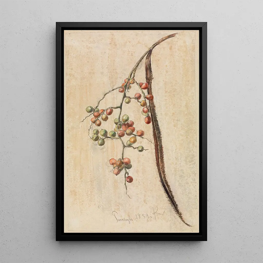 I denne kunsttryk af « Studie af en gren med frugt » inviterer Ferdinand Keller os til at dykke ned i en verden, hvor naturen blomstrer med en forbløffende delikatesse. De levende farver på frugterne, blandet med de bløde nuancer af bladene, skaber en visuel harmoni, der øjeblikkeligt fanger opmærksomheden. Kellers teknik, der kombinerer præcision og følsomhed, gør det muligt næsten at føle teksturen af frugterne og friskheden af bladene. Den overordnede atmosfære i værket fremkalder en fredelig kontemplation, hvor hvert element synes at fortælle en historie om liv og vækst.