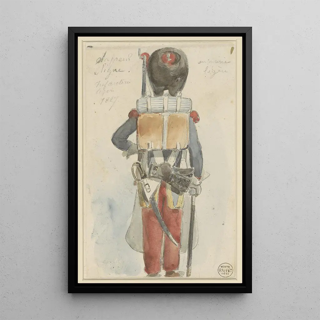 Denis Auguste Marie Raffet, aktiv i det 19. århundrede, er anerkendt for sit enestående talent inden for tegning og kunstgravering. Påvirket af romantikken formåede han at fange den militære ånd i sin tid, især gennem sine skildringer af kampe og soldater. Raffet var også et aktivt medlem af Barbizon-skolen, hvor han udviklede en unik stil, der kombinerede realisme og idealisering. Hans kunsttryk "Studie af uniform" vidner om hans engagement i at udleve den militære livsstil, hvilket gør ham til en ikonisk figur i den franske kunst i det 19. århundrede.
