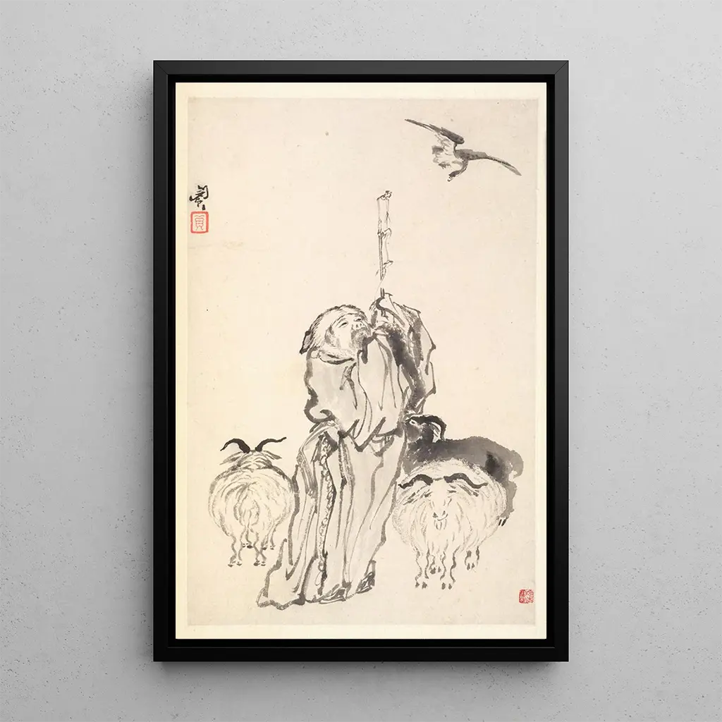 Kunsttrykket Su Wu le berger, udført af Min Zhen, indfanger essensen af en kinesisk legende præget af tapperhed og troskab. De livlige og dynamiske farver, kombineret med udtryksfulde træk, giver liv til denne ikoniske figur. Teknikken med blækmaleri, kombineret med farvetouch, skaber en livlig og engagerende atmosfære. De omhyggelige detaljer i det omkringliggende landskab, med sine majestætiske bjerge og dramatiske himmelstrøg, styrker den heroiske fortælling om Su Wu. Dette lærred inviterer seeren til at dykke ned i en historie rig på følelser og menneskelige værdier.