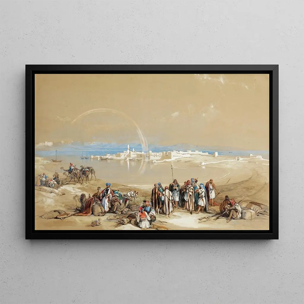 Kunsttrykket Suez af David Roberts tager os med til kanten af den eponyme kanal, hvor Orienten blander sig med Vesten. De varme og gyldne farver fremkalder det strålende lys fra den egyptiske sol, mens de detaljerede skildringer af både og landskaber skaber en atmosfære, der er både levende og fredelig. Roberts, med sin oliemaleriteknik, formår at fange magien i dette ikoniske sted og inviterer betragteren til at dykke ned i denne livsfulde scene. Hvert penselstrøg synes at fortælle en historie og afslører skønheden og vigtigheden af denne maritime passage.