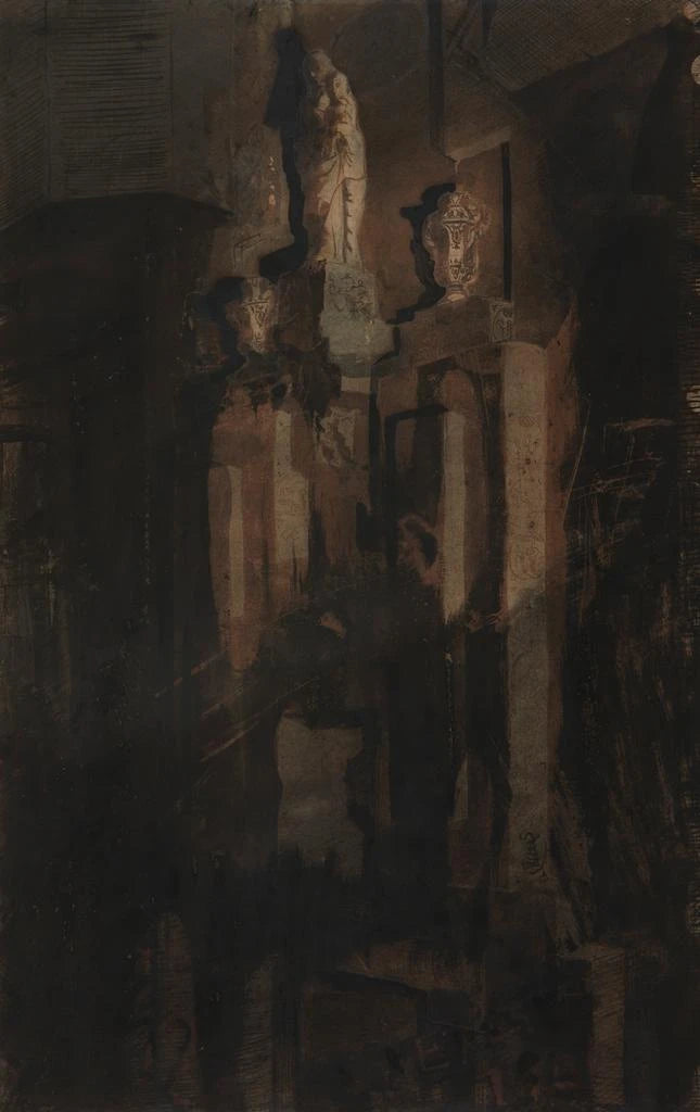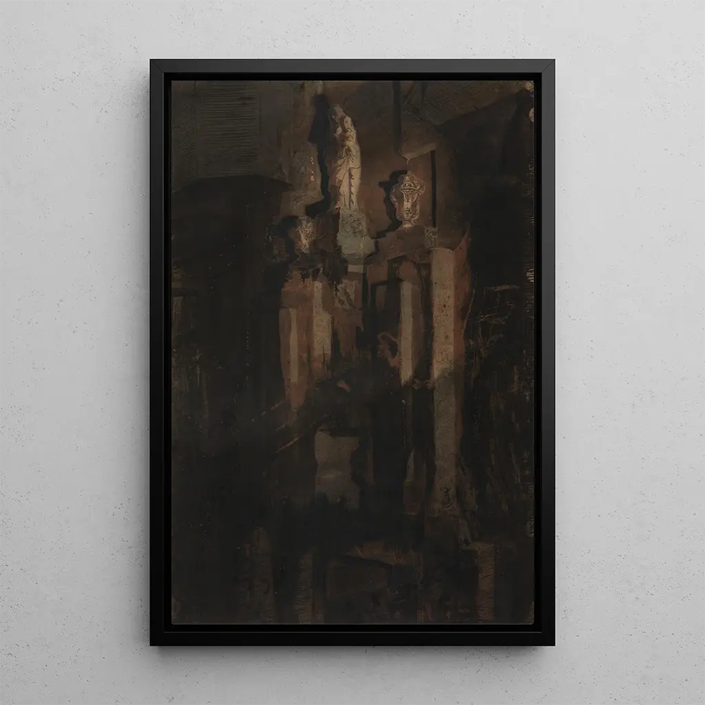 I dette værk udforsker Victor Hugo de menneskelige sjæls labyrinter gennem en rig sammensætning fyldt med nuancer. De mørke farver og de subtile belysninger skaber en atmosfære, der er både melankolsk og introspektiv. Kunstnerens teknik, der blander skygger og lys, inviterer betragteren til at dykke ned i en refleksion over eksistensen og den menneskelige tilstand. Hvert detalje, hver penselstrøg synes at fortælle en historie, en søgen efter mening, der dybt resonnerer i os. Lærredet, med sin følelsesmæssige intensitet, bliver et spejl af vores egne indre kampe.