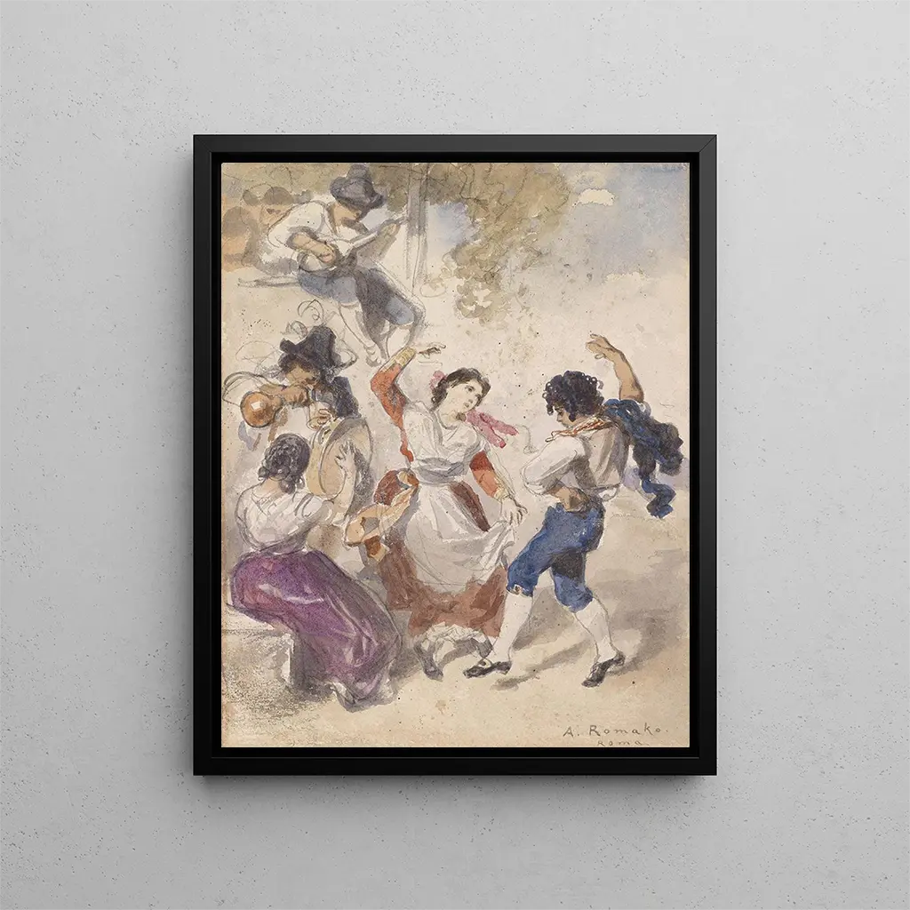 Reproduktion Tarentelle - Anton Romako – Introduktion fascinerende L'maleri "Tarentelle" af Anton Romako er et værk, der med stor dygtighed fremkalder den italienske kultur og dens livlighed. Gennem dette ikoniske stykke formår kunstneren at fange et øjeblik af jubel og bevægelse, hvor dans og musik flettes sammen i et fascinerende visuelt show. Værket transporterer os til en pulserende verden, hvor passionen og energien fra tarentelle, en folkevise fra det sydlige Italien, får liv på lærredet. Lyset og farverne, omhyggeligt udvalgt, synes også at danse, hvilket skaber en fortryllende atmosfære, der inviterer betragteren til at dykke ned i dette maleri. Stil og særpræg ved værket Anton Romakos stil er præget af en impressionistisk tilgang, hvor lys og farve spiller en central rolle. I "Tarentelle" vidner de dynamiske penselstrøg og de livlige nuancer om et ønske om at fange øjeblikket og gøre dansens energi håndgribelig. Personerne, klædt i traditionelle kostumer, er afbildet i en levende positur, deres flydende bevægelser antyder en blomstrende koreografi. Kompositionen er omhyggeligt orkestreret, hvor hvert element bidrager til den overordnede harmoni i værket. Selv om detaljerne er til stede, tynger de aldrig scenen, men beriger tværtimod den visuelle oplevelse og giver betragteren mange interessante punkter at udforske. Kunstneren og hans indflydelse Anton Romako, maler af østrigsk oprindelse, formåede at gøre sig gældende på den europæiske kunstscene i det 19. århundrede takket være sit enestående talent og sin evne til at fange essensen af sine motiver. Influenceret af tidens kunstbevægelser formåede han at forene tradition og modernitet, idet han integrerede elementer af den folkelige kultur i sine værker. Hans fascination af dagligdagen og de folkelige traditioner kommer tydeligt til udtryk i "Tarentelle", hvor han hylder Italiens kulturelle rigdom. Romako bidrog dermed til genopdagelsen og værdsættelsen af folkelig kunst og inspirerede mange kunstnere til at udforske lignende temaer. Hans arv består, og hans arbejde fortsætter med at være en inspirationskilde for dem, der ønsker at fejre skønheden