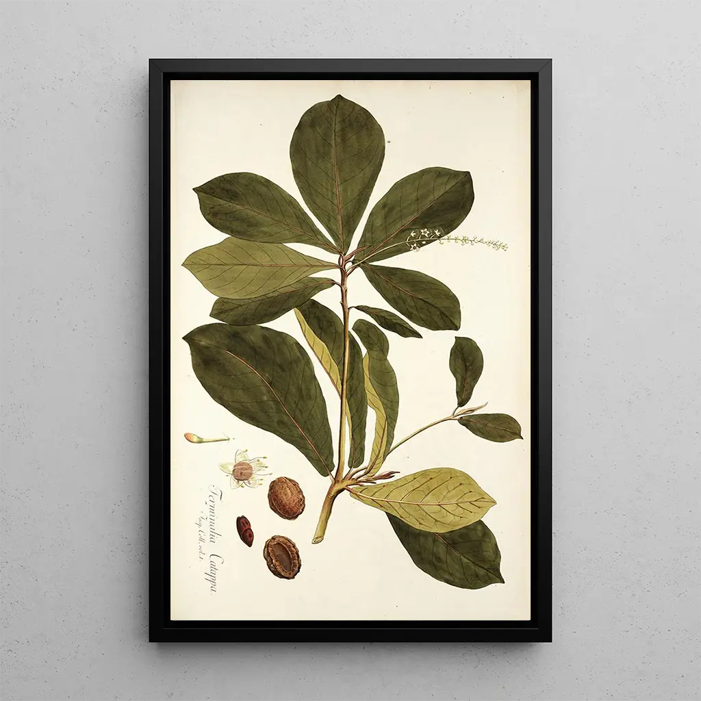 I denne kunsttryk af Terminalia catappa fanger kunstneren Nikolaus Joseph Freiherr von Jacquin majestæten af et ikonisk træ. Lærredet skiller sig ud med sine livlige farver, der spænder fra dybe grønne til gyldne nuancer, hvilket fremkalder varmen fra troperne. Akvarelteknikken, delikat og præcis, hylder teksturen af bladene og det filtrerede lys gennem deres løv. Stemningen, der udspringer af dette værk, inviterer til eftertanke og transporterer betragteren til en verden, hvor naturen regerer som herre.