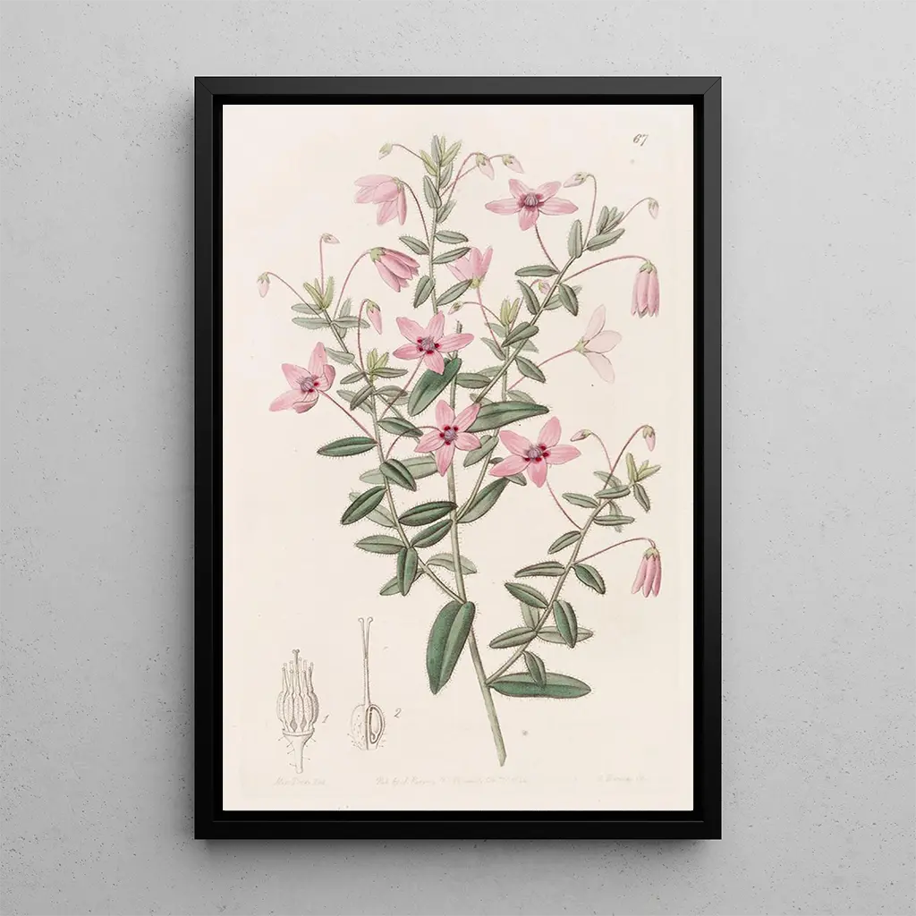Den kunsttryk af Tetratheca velue fra Sydenham Edwards er en ægte fejring af den australske flora. Med sine nuancer af rosa og grøn fremkalder dette lærred en livlig og dynamisk stemning. De præcise detaljer af kronblade og blade, udført med en raffineret illustratorteknik, formidler en følelse af friskhed og vitalitet. Hvert element i kompositionen synes at fortælle en historie og inviterer seeren til at udforske den unikke skønhed af denne ikoniske plante.